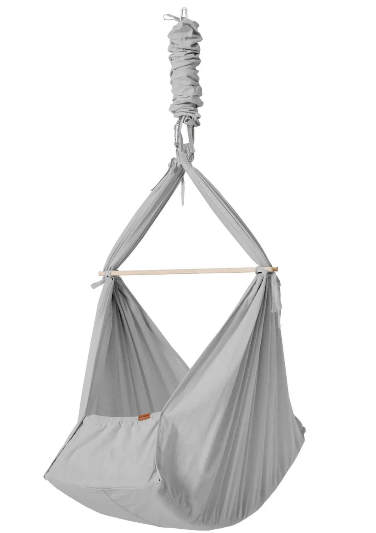 - Federwiege aus ökologischer Baumwolle inkl. Querstange, Feder mit Sicherungsgurt, Stoffbeutel, Matratze mit abnehmbarem Bezug, Spannbettlaken, Karabiner mit Schraubverschluss und Gummiisolierung