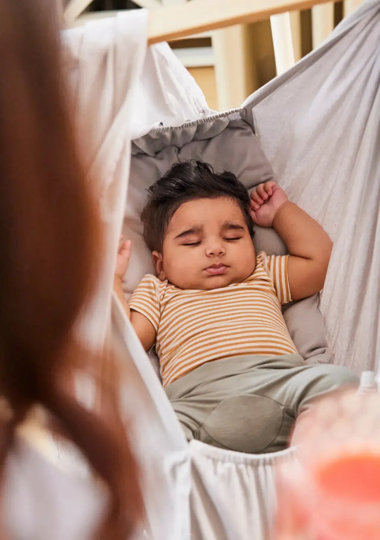 In dieser gemütlichen Premium-Federwiege fühlt sich dein Baby sicher und geborgen. Sanfte Schaukelbewegungen, die an die Zeit im Mutterleib erinnern, helfen selbst unruhigen Neugeborenen wirkungsvoll, dabei zur Ruhe zu kommen und fördern einen tiefenentspannten Schlaf. Die Premium-Variante kommt mit bequemer Matratze aus reiner Wolle und verfügt über einen zusätzlichen Baldachin für noch mehr Behaglichkeit. Dieser schirmt dein Kind von der Außenwelt ab, reduziert Lichteinfall und Geräuschkulisse und erzeugt eine ganz wunderbare Schlafatmosphäre im Inneren der modernen Hängematte. Gleichzeitig dient der Wiegenvorhang als Moskitonetz zum Schutz vor Insekten.