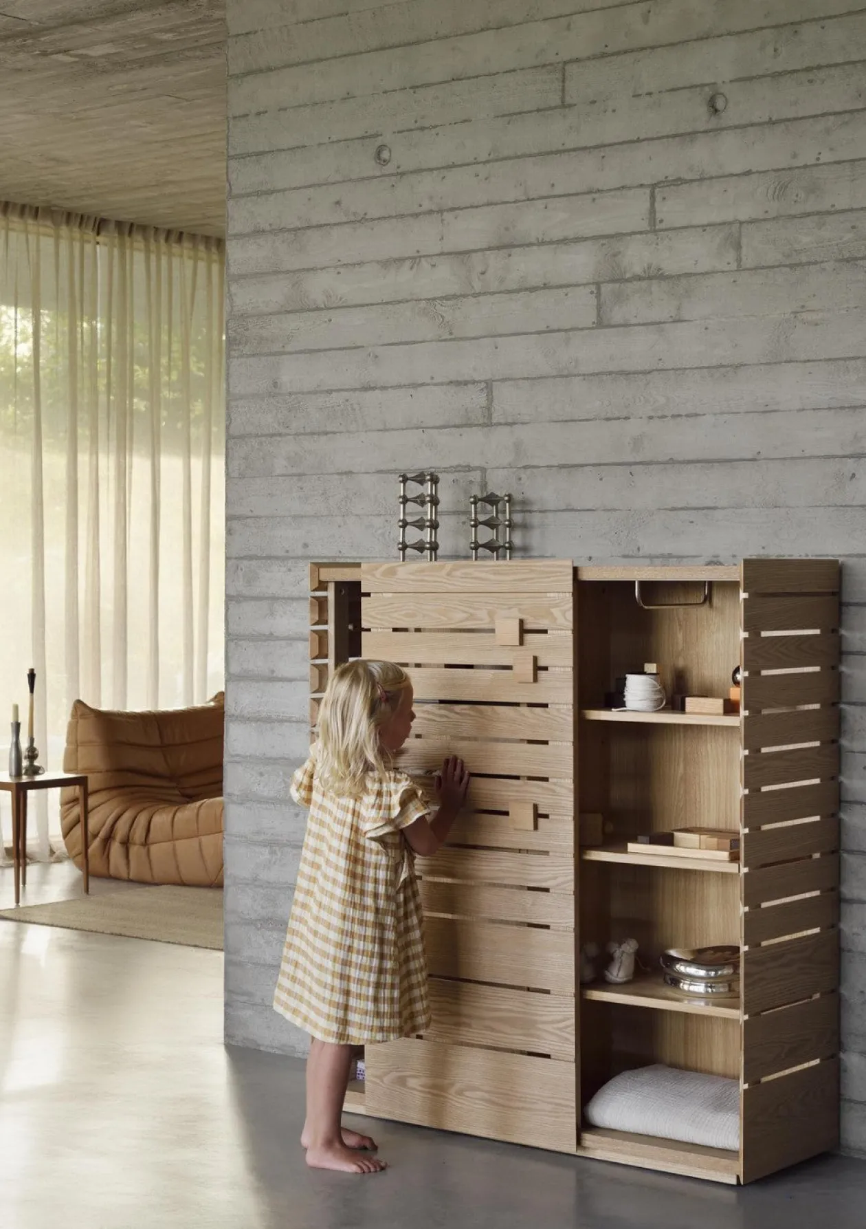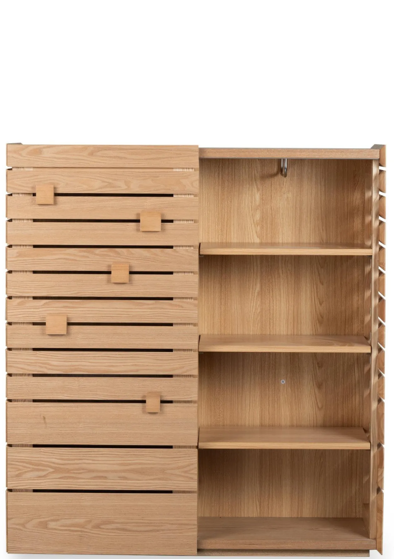 Ein besonderes Designdetail sind die beweglichen Holzblöcke an der Außenseite, ein verspieltes Element, das Kinder zum Entdecken anregt und dem Möbelstück einen individuellen Charakter verleiht. Für maximale Flexibilität kann der Aufbewahrungsschrank frei stehend oder wandmontiert verwendet werden – ganz nach Raum und Stil. Mit seiner klaren Formensprache und der natürlichen Eschenoptik wird er zum Hingucker in jedem Raum.