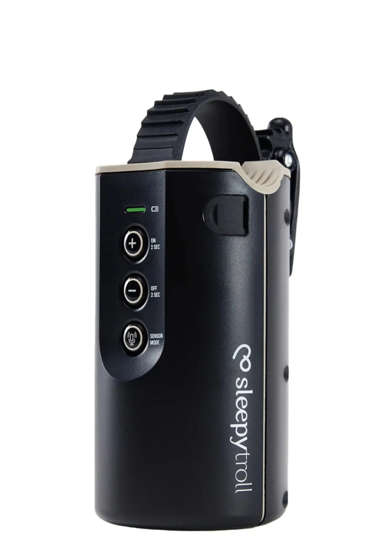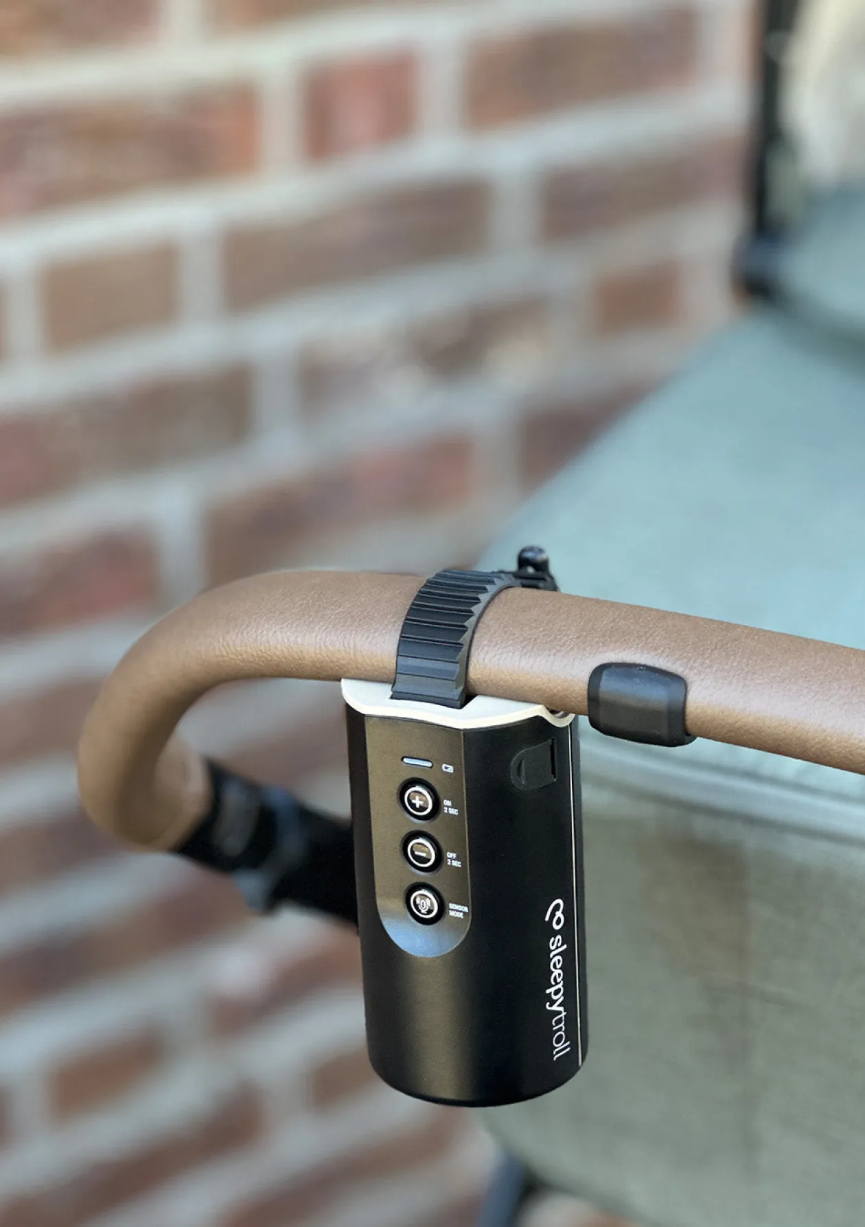 - Vergewissern Sie sich, dass der Sleepytroll sicher am Lenker befestigt ist und senkrecht hängt, wobei die Sensoren (auf der Rückseite des Sleepytroll) zum Baby zeigen.