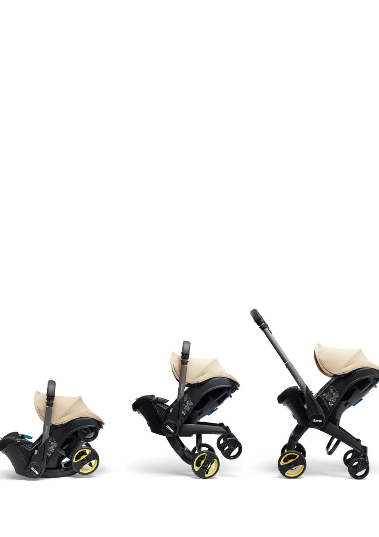Wichtiger Hinweis: Sie müssen alle Taschen aus der Doona i entfernen, bevor Sie die Räder zusammenklappen und in den Autositzmodus wechseln.