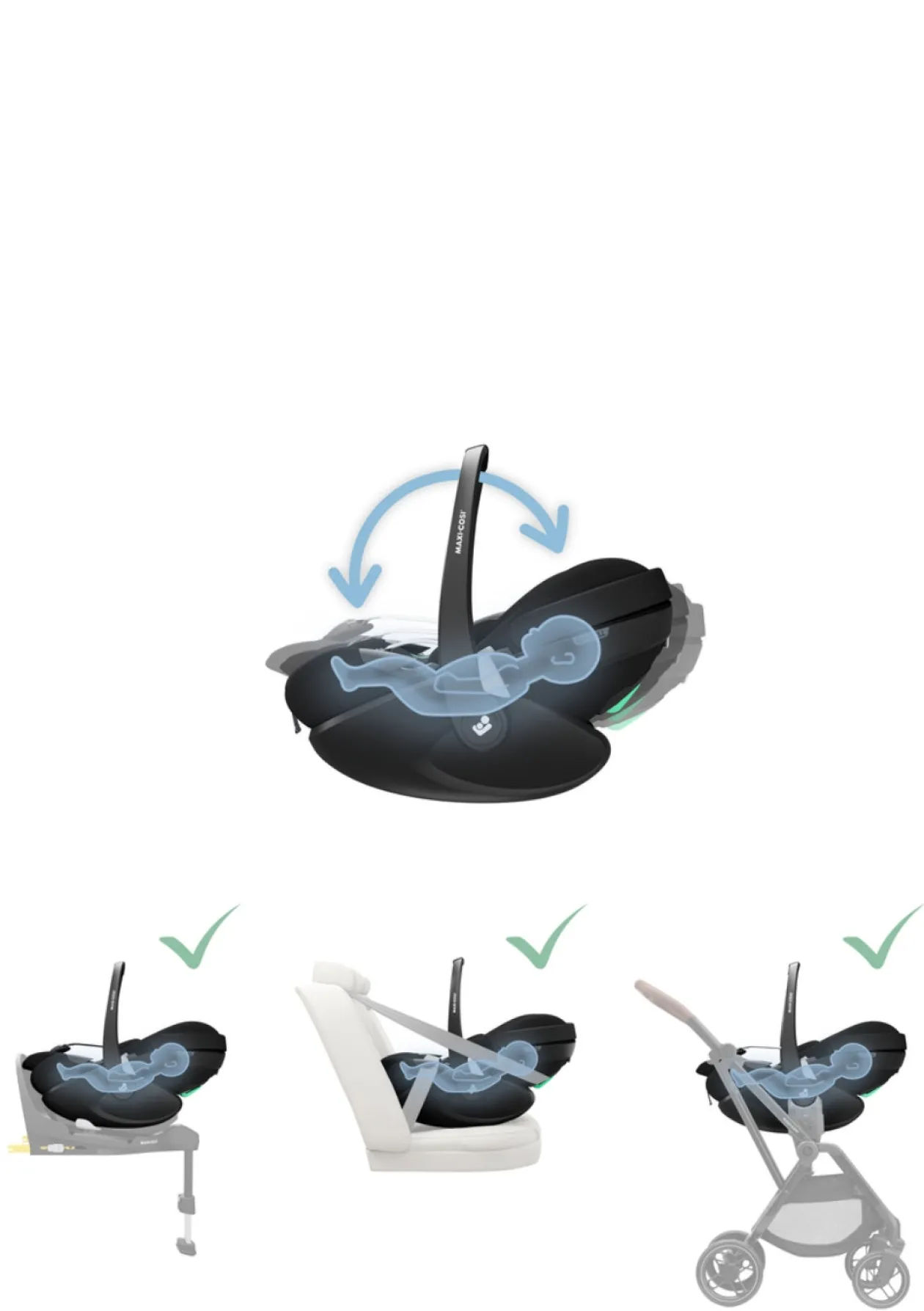- kompatibel mit der Maxi-Cosi FamilyFix 360 (Pro) Basisstation (separat erhältlich), alternativ per Fahrzeuggurt anbringbar