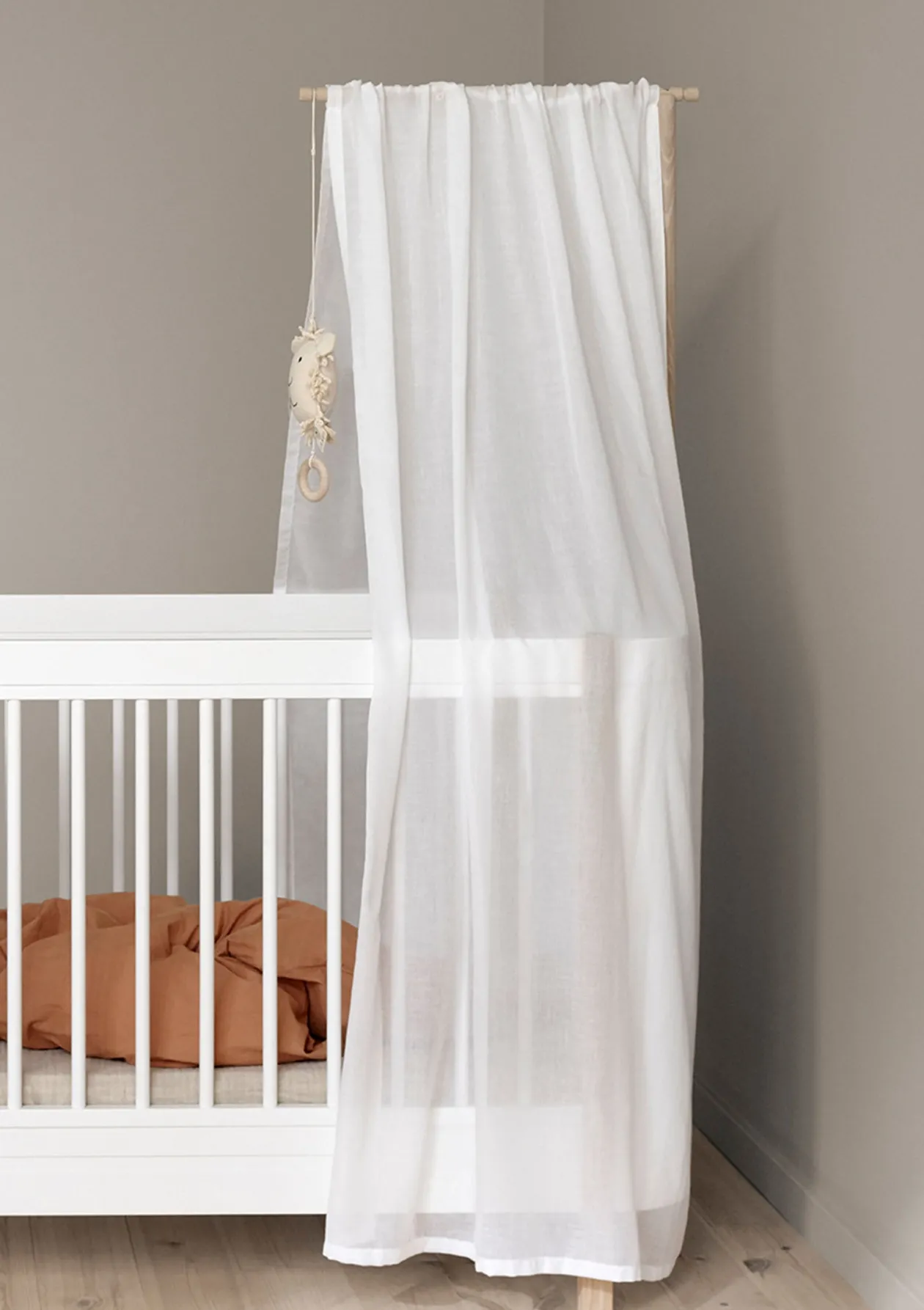 Dieses wunderschöne Stück Stoff macht aus dem ‚Wood‘ Mini+ basic ein zauberhaftes Himmelbett. Einfach über die separat erhältliche Himmelstange gezogen, sorgt es für eine noch familiärere Atmosphäre, schützt vor zu viel Licht und passt sich perfekt in dein Schlafzimmer ein.