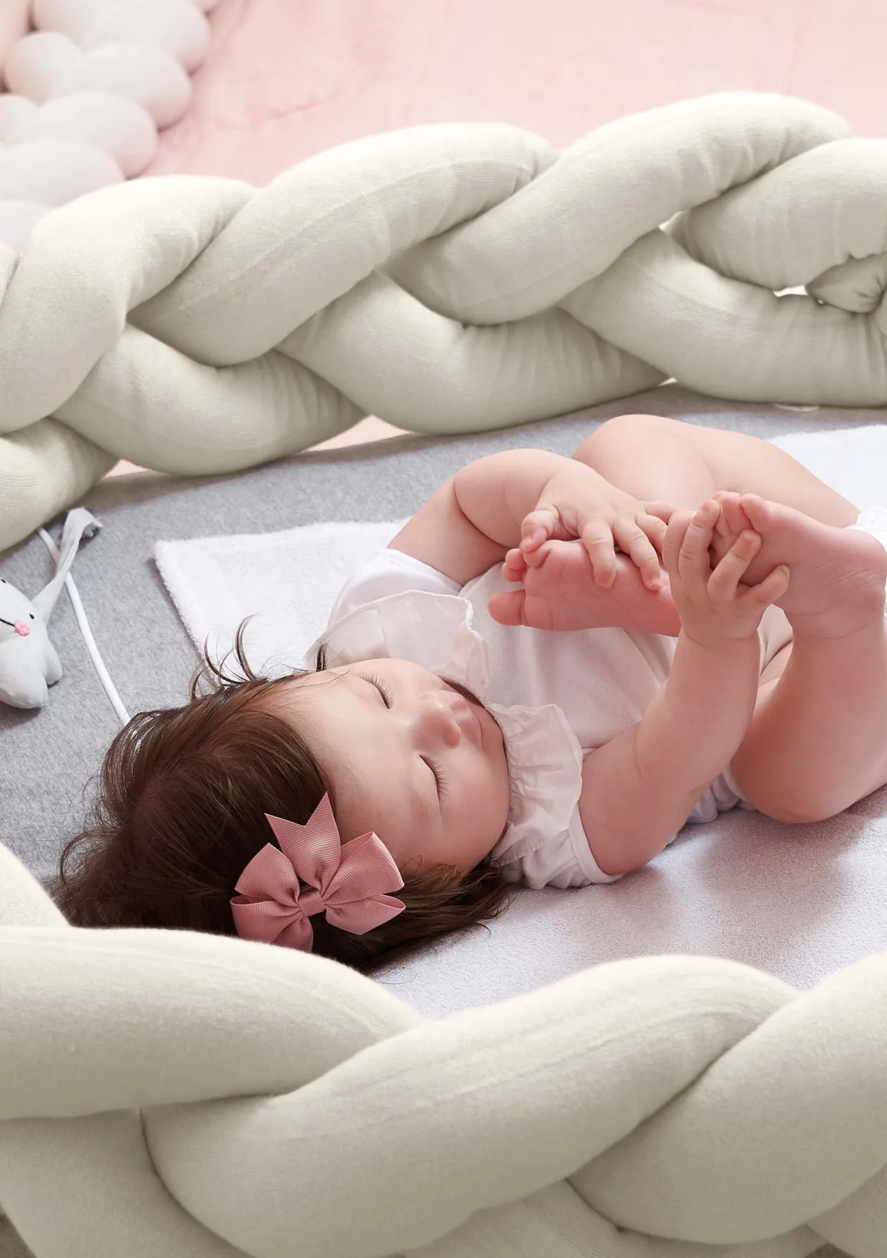 - kuschelig weiche Strick-Oberfläche schützt das empfindliche Köpfchen im Bettchen