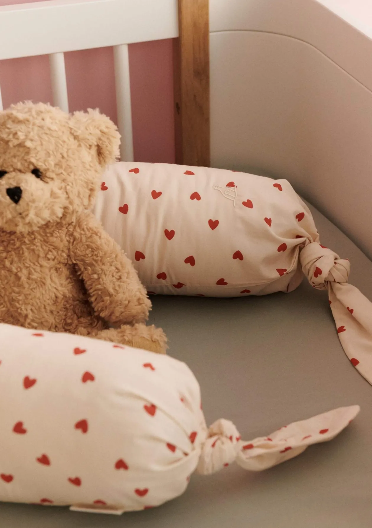 Diese liebevoll gestaltete Bettschlange verwandelt jedes Kinderbett in eine besonders behagliche Schlafumgebung. Das romantisch-verspielte Dessin mit zarten Herzen sorgt für eine sanfte, harmonische Atmosphäre und macht das Modell zu einem echten Hingucker im Babyzimmer. Gleichzeitig bietet die Bettschlange optimalen Schutz, indem sie dein Kind zuverlässig vor harten Gitterstäben oder dem Bettgestell bewahrt. Die Knotendetails an den Enden und der abnehmbare Bezug aus reiner Bio-Baumwolle unterstreichen die hochwertige Verarbeitung. Ein vielseitiger Begleiter, der Sicherheit und Geborgenheit schenkt.