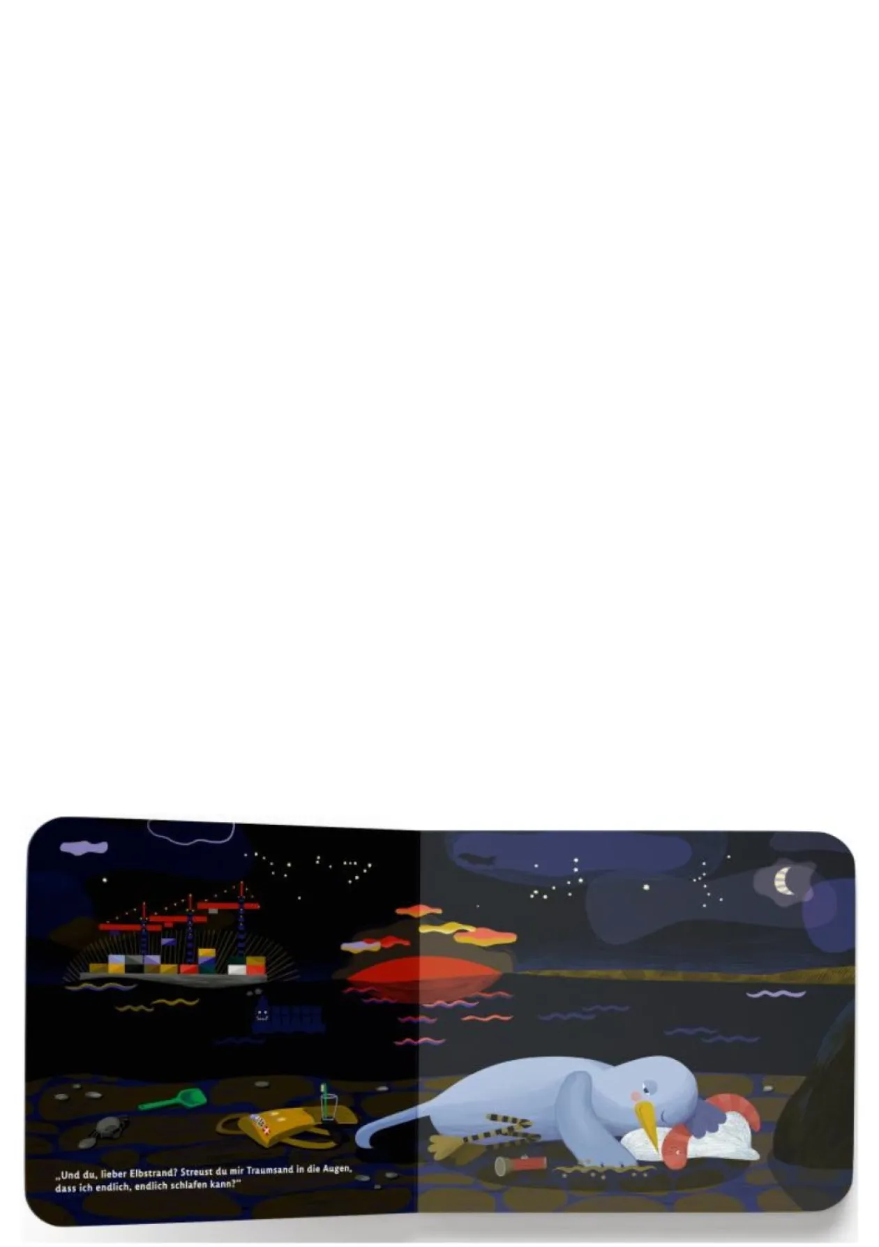 Als es ihr im Winter an der Nordsee zu kalt wird, beschließt die Möwe Mona nach Hamburg zu fliegen, um in der Stadt zu überwintern. Einen ganzen Tag ist sie unterwegs, bis endlich Hamburg in Sicht kommt. Aber dort angekommen, ist es überall viel zu laut, zu hell und zu schmutzig. Wo soll sie nur schlafen? Auf einem Schiff vielleicht? »Ich bin so müde. Wiegst du mich in den Schlaf, liebes Schiff?«, fragt Mona, aber dann schaukelt das Boot viel zu heftig und es wird nichts mit dem verdienten Schlaf. Dann vielleicht besser im Stadtpark? »Ich bin so müde. Zählst du mit mir die Sterne am Himmel, liebes Planetarium?«, fragt die Möwe, aber dann entpuppt sich der Sternenhimmel als viel zu lautes Feuerwerk. Und so muss Mona auf dem Fischmarkt, dem Dom und im Hafen noch einige weitere Versuche unternehmen, bis sie am Elbstrand endlich in einen traumschweren Schlaf fällt. Dieses Einschlafbuch von Hamburg-ABC-Zeichnerin Karin Lindeskov schickt kleine Zu-Bett-Geherinnen mit seinen magisch-realistischen Bildern der nächtlichen Stadt zuverlässig ins Land der Träume und wird durch seine vielen charmanten Illustrationsdetails auch Vorleserinnen und Vorlesern so schnell nicht langweilig.