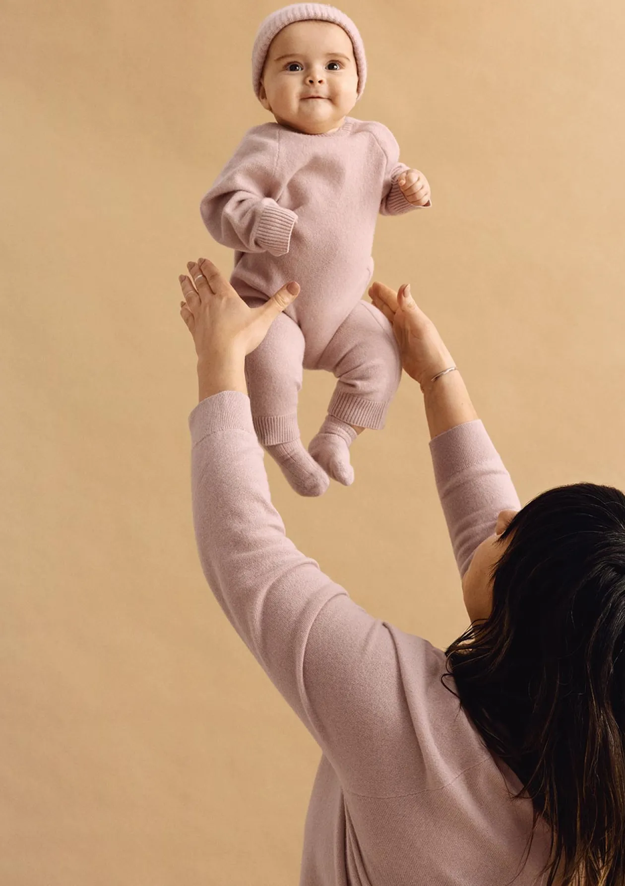 Das Herzstück der Kollektion ist hochwertiger Cashmere der Qualitätsklasse A, nachhaltig und fair gewonnen in der inneren Mongolei. Die hauchfeinen, extra langen Fasern (14,5–15,5 Mikron) machen jedes Teil unvergleichlich weich, temperaturausgleichend und formstabil. Cashmere ist von Natur aus hypoallergen, lanolinfrei und antibakteriell und daher besonders sanft zu empfindlicher Babyhaut. Dank seiner isolierenden Eigenschaften wärmt er im Winter und bleibt im Sommer angenehm leicht und atmungsaktiv.