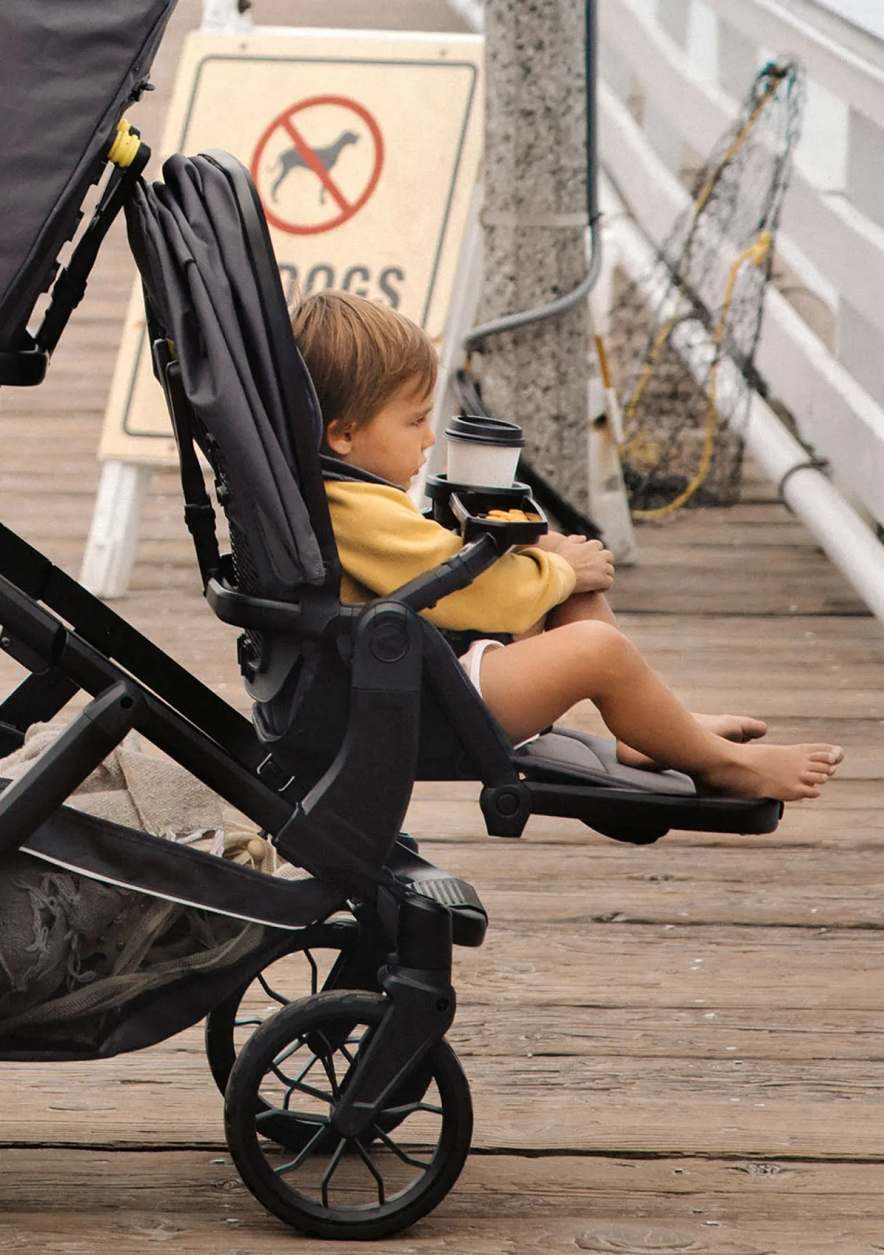 Der Esstisch von VEER für euren Switchback Sitz, lässt sich ganz einfach anstelle des Bauchbügels am Rahmen einklicken. Der Tisch ist aufgeteilt in zwei Bereiche. Ein Tablett, für Essen und Snacks, und einen Becherhalter, mit elastischen Halterungsstreifen, damit Becher oder Flaschen während der Fahrt besser halten.