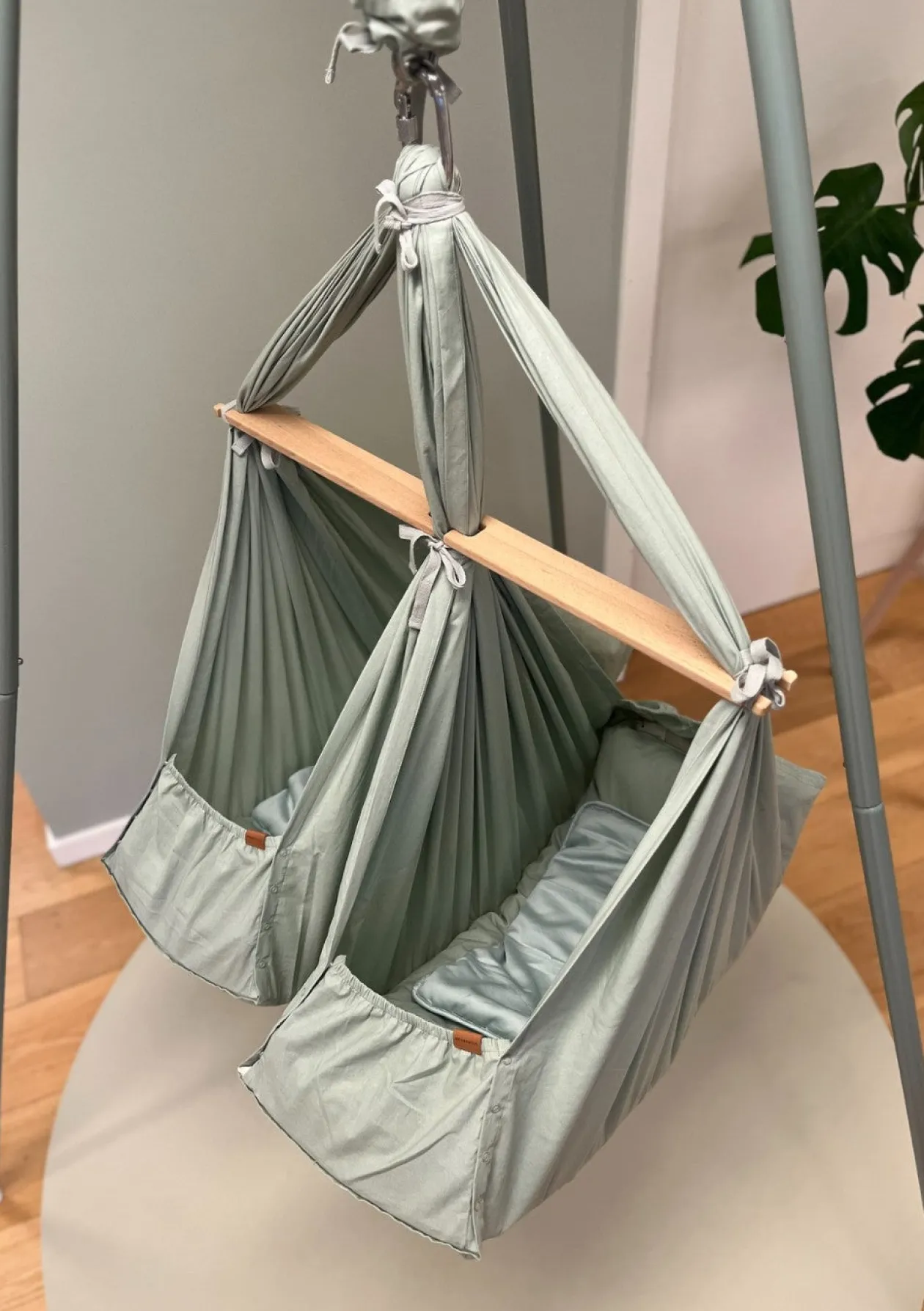 Komplettiert wird die Zwillings-Federwiege aus hautfreundlicher ökologischer Baumwolle mit dem stabilen Wiegenständer und dem LeeLo02 Federwiegenmotor, der die beruhigenden Bewegungen per Knopfdruck erzeugt und sich bequem über eine App steuern lässt. Beides ist separat erhältlich.