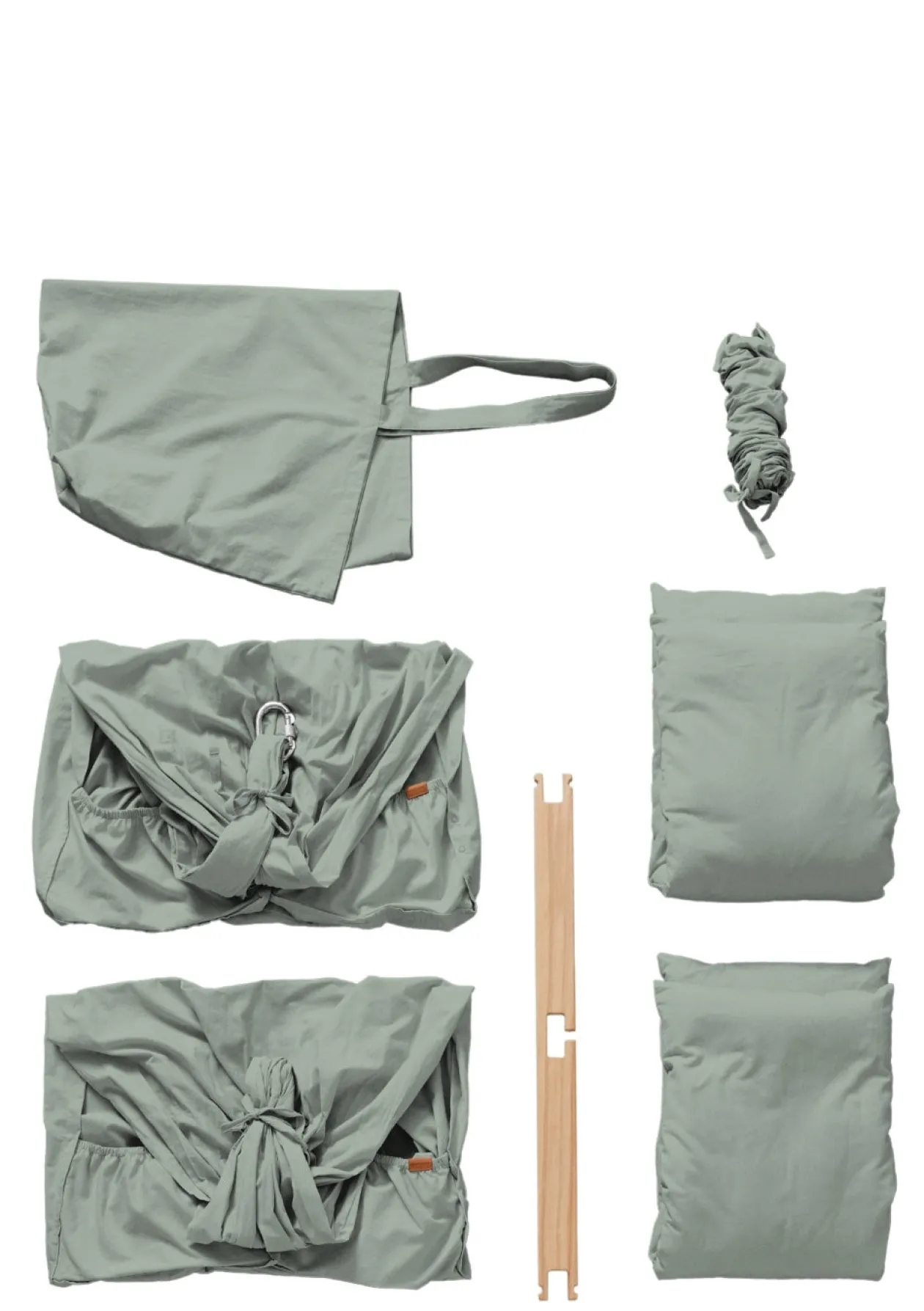 - Zwillings-Federwiege aus ökologischer Baumwolle inkl. Querstange, Feder mit Sicherungsgurt, Stoffbeutel, Matratze mit abnehmbarem Bezug, Spannbettlaken, Karabiner mit Schraubverschluss und Gummiisolierung