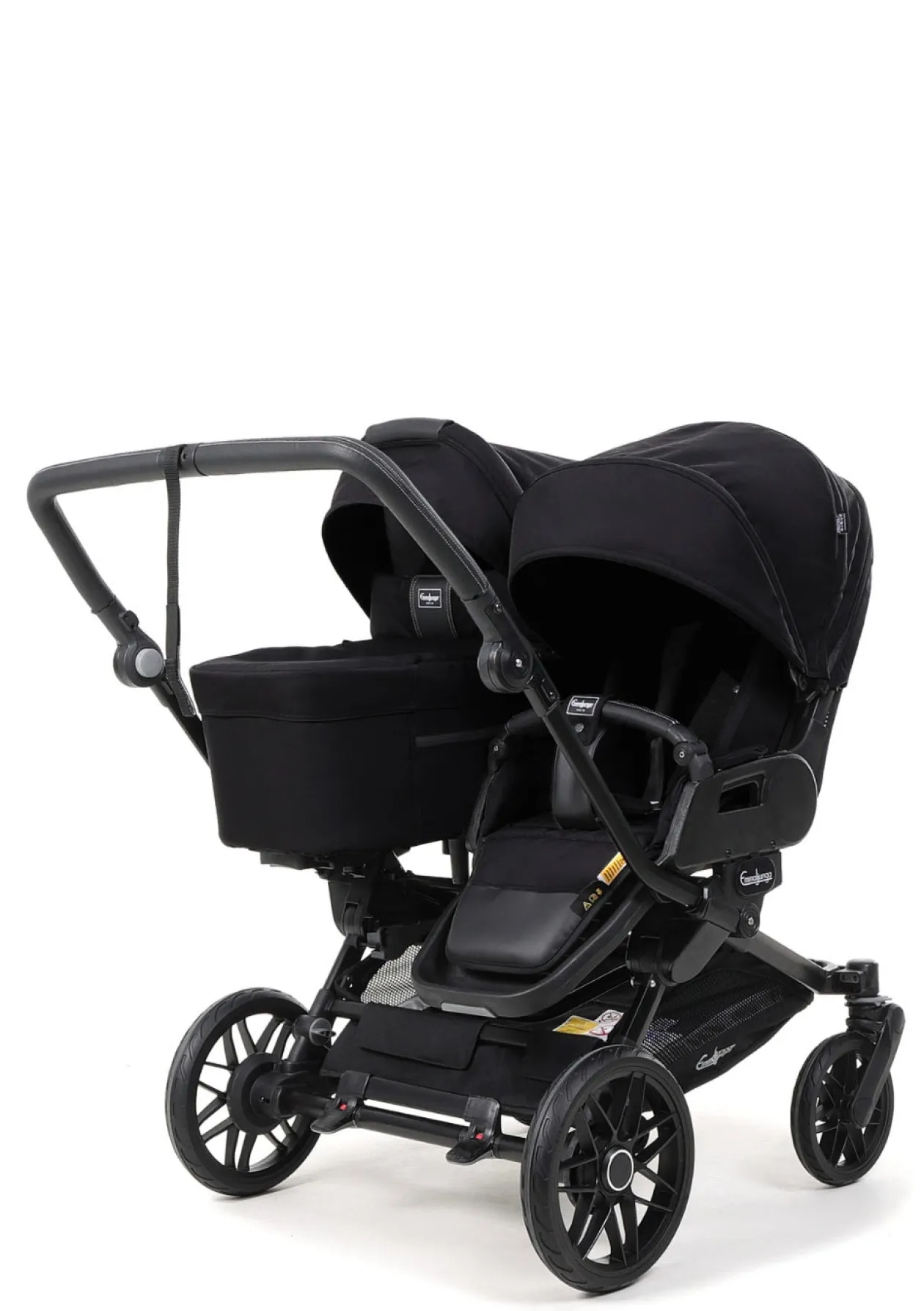 Die fantastische Vierradfederung mit einstellbarer Hinterradfederung garantiert eine komfortable, ruhige Fahrt mit zwei Kindern. Unebenheiten werden zuverlässig abgefedert, sodass beide entspannt unterwegs sind. Das Gestell lässt sich einfach zusammenklappen und superkompakt verstauen. Der klappbare Griff erleichtert zudem das Reisen mit Bus und Bahn.