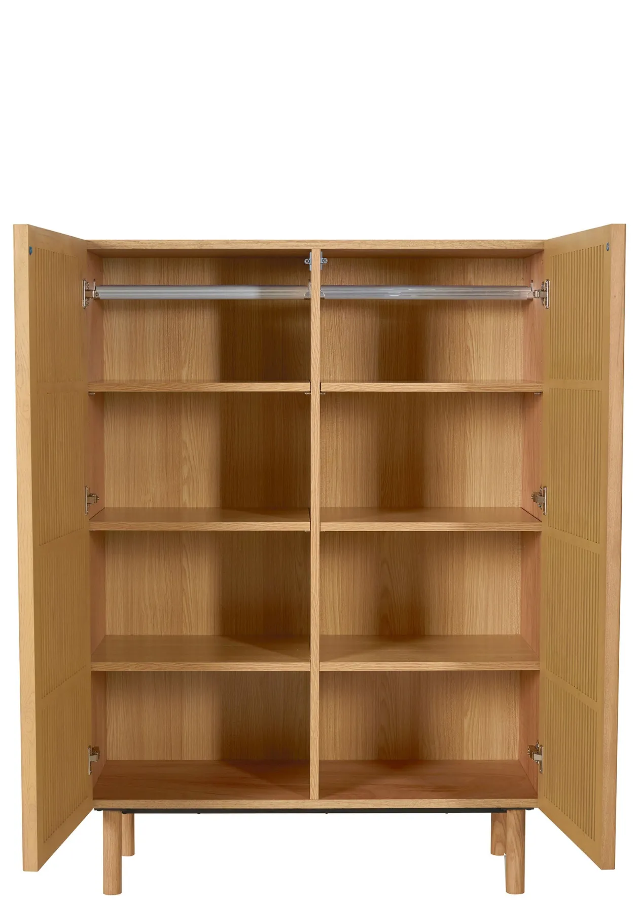 - Material: MDF-furniertes Eschenholz, Türen mit transparenten Streben aus massivem Eschenholz