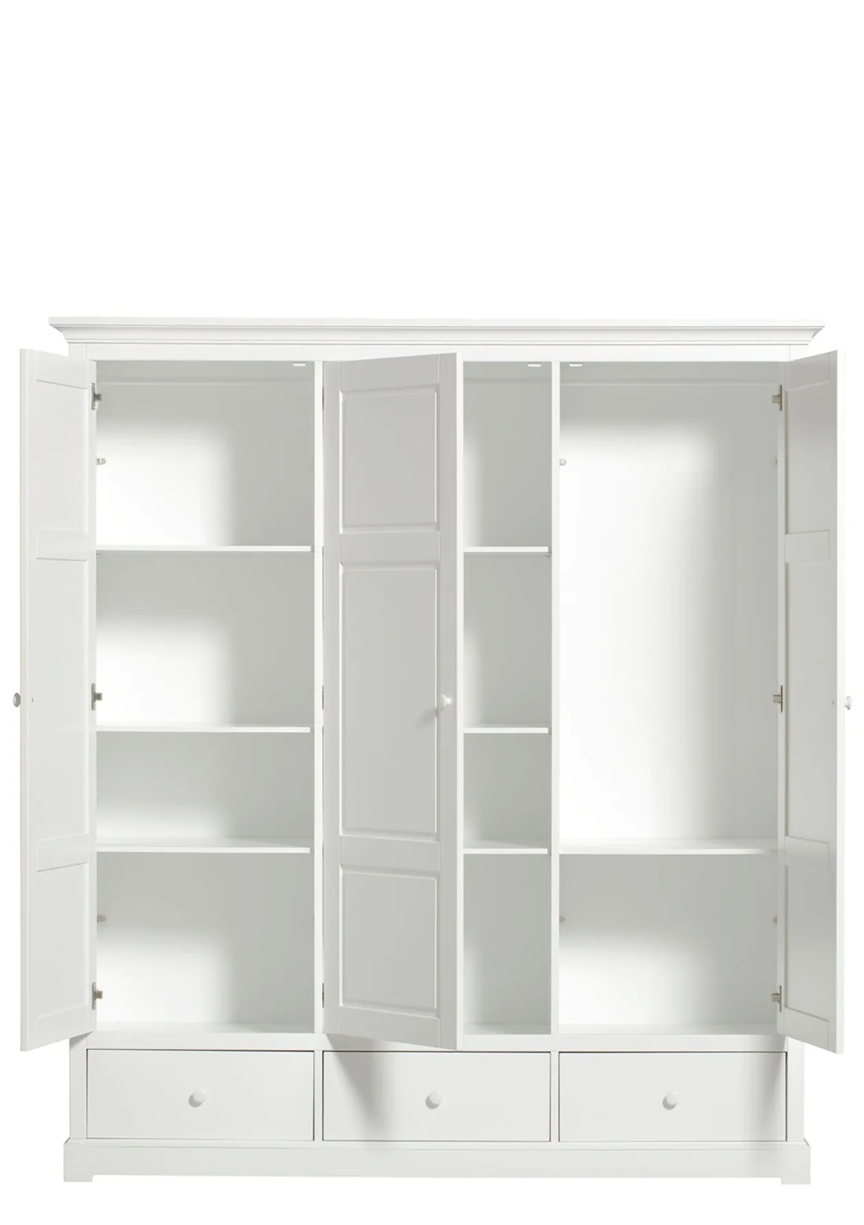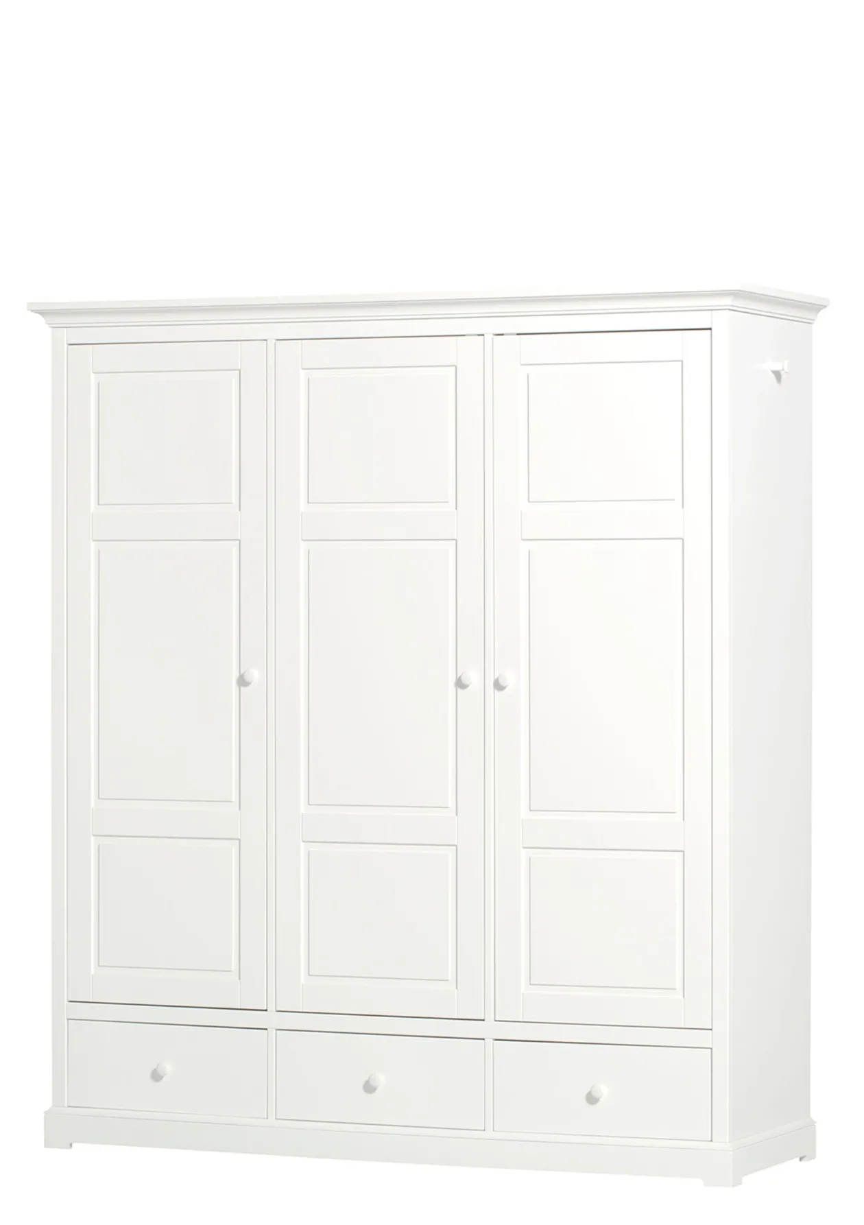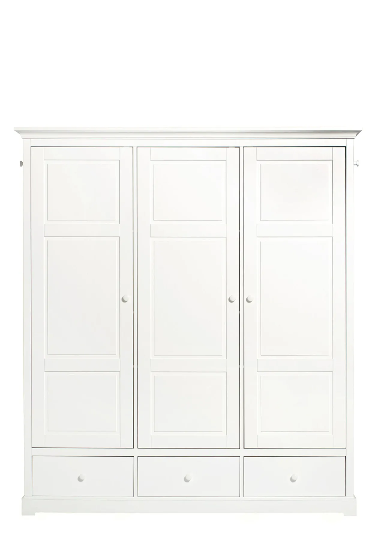 Zeitlos & klassisch schön: der dreitürige Kleiderschrank im nordischen Design aus der Seaside Collection von OLIVER FURNITURE. Der Innenraum kann flexibel mit 12 herausnehmbaren Regalen gestaltet werden. Zudem bieten 3 geräumige Schubladen Platz und auf der durchgehenden Kleiderstange könnt ihr Kleidungsstücke auf der gesamten Breite aufhängen. Durch sein klassisches Design fügt sich der Kleiderschrank leicht in jeden Raum und unterschiedliche Einrichtungen ein.