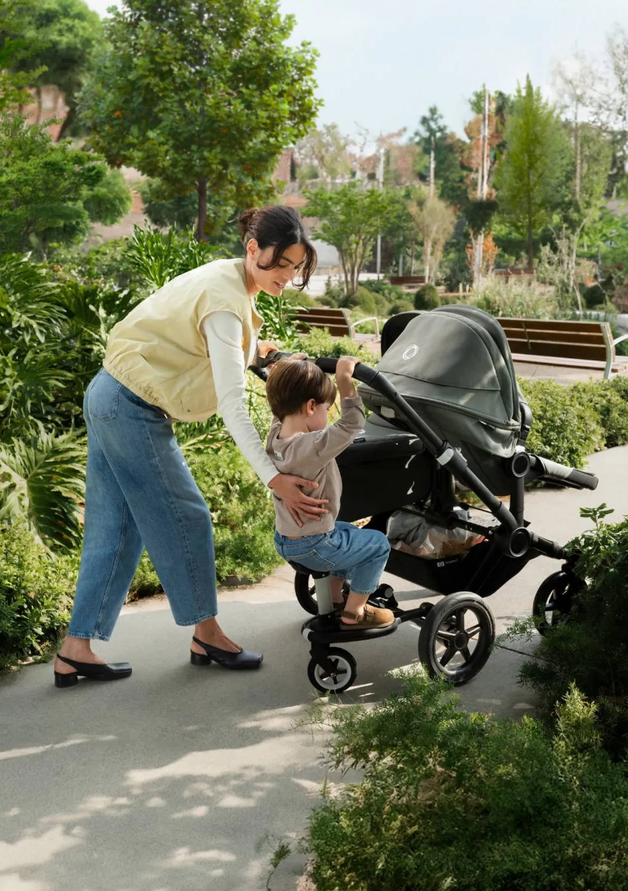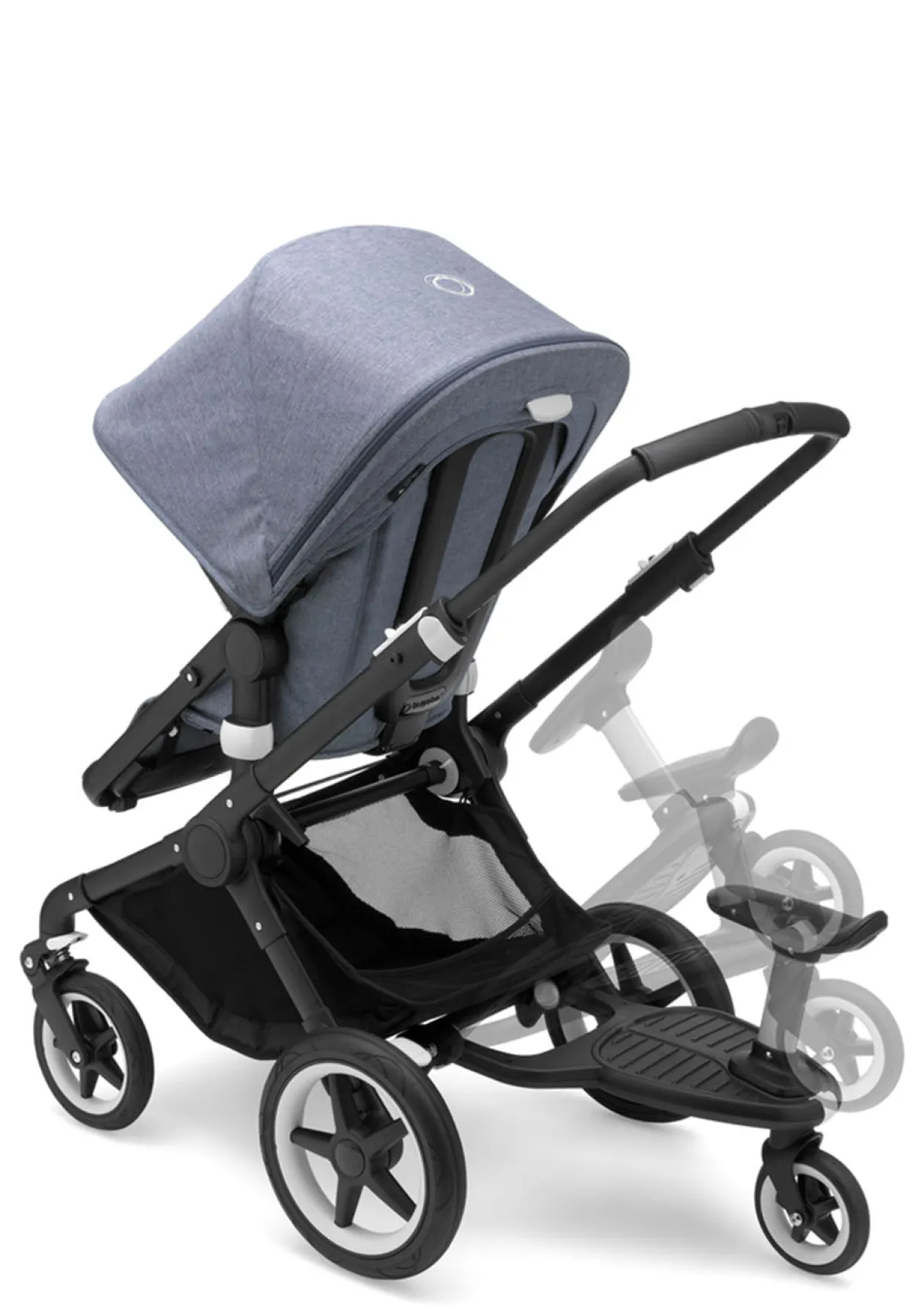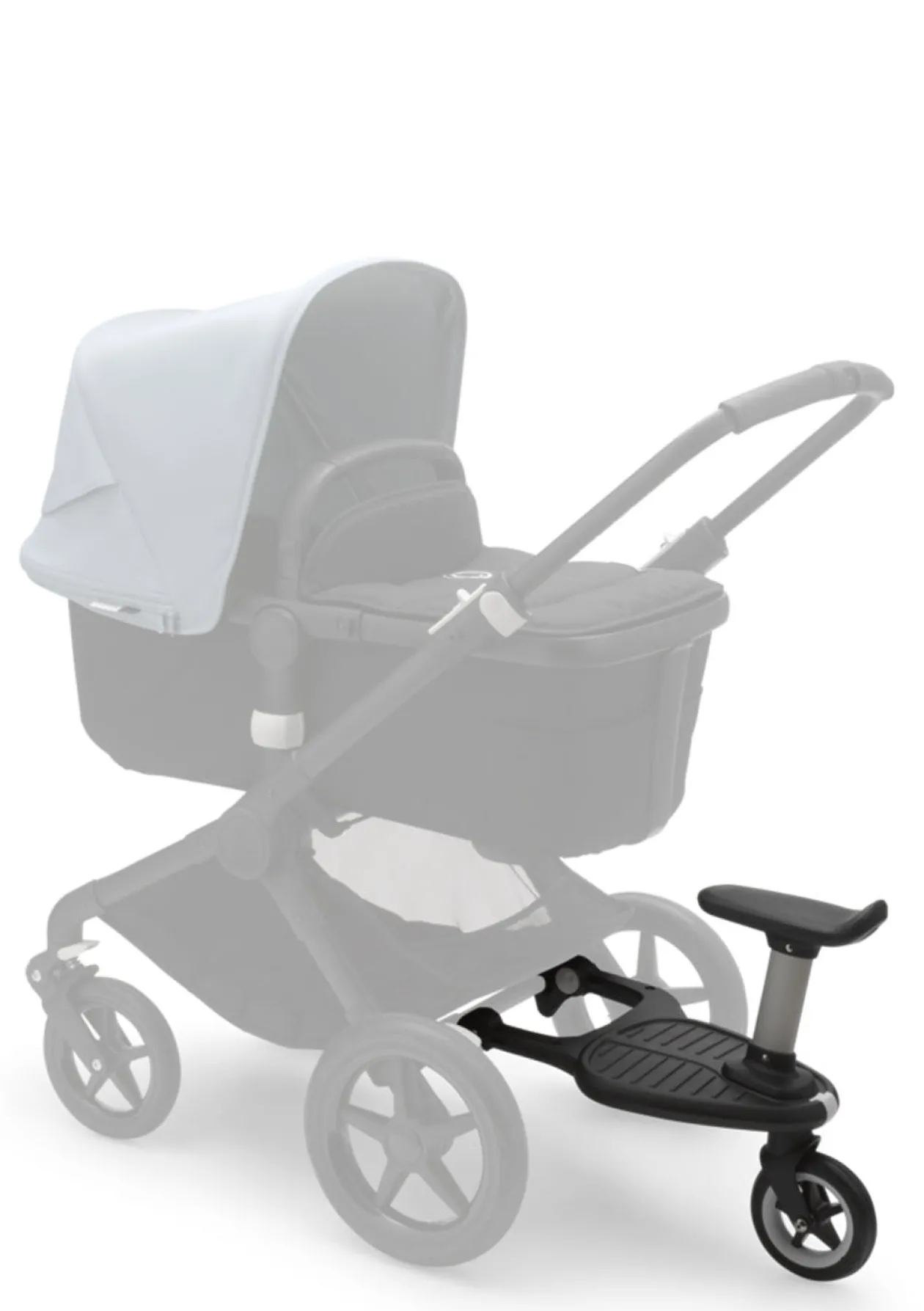 Das Mitfahrbrett Komfort+ von BUGABOO macht eure Ausflüge mit zwei Kindern besonders flexibel! Während das kleine Kind die Fahrt im Kinderwagen genießt, darf das Geschwisterkind auf das Mitfahrbrett steigen. Sollten die kleinen Beine doch mal müde werden, könnt ihr schnell und einfach den Sitz des Mitfahrbretts aufstecken und die Fahrt geht bequem im Sitzen weiter. Das gefederte Schwenkrad sorgt dabei immer für eine komfortable Fahrt. Mit nur einem Klick ist das Brett installiert. Ihr könnt wählen, ob das Brett mehr nach links oder rechts versetzt montiert wird, damit ihr genügend Beinfreiheit zum Schieben habt, ohne mit Füßen dagegen zu stoßen. Die Möglichkeit, das Mitfahrbrett ohne Passagier nach oben zu klappen oder einfach abzumontieren und im Korb des Kinderwagens zu verstauen, macht die Nutzung so bequem wie möglich!