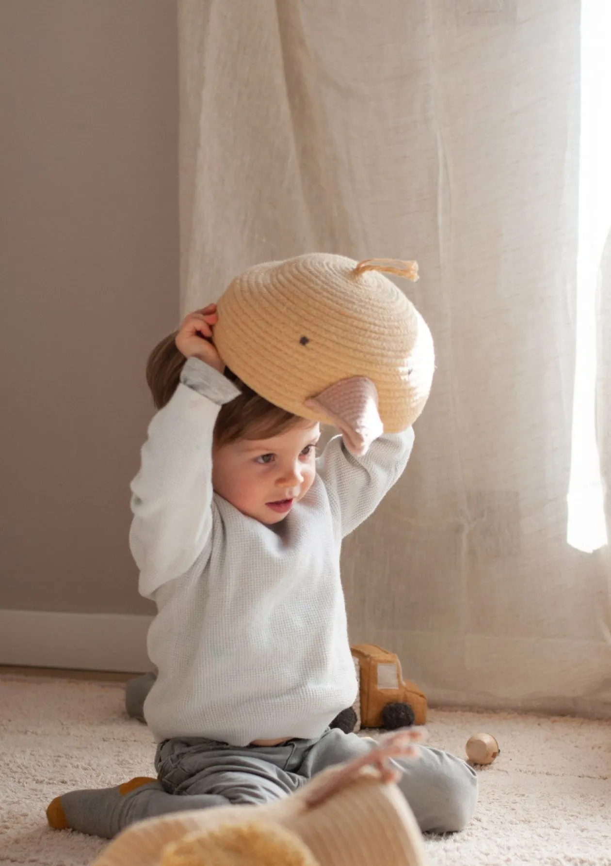 Der einzigartige Korb wird von Kunsthandwerkern in Indien von Hand geflochten – aus weichem Baumwollgarn und Polyesterfasern, die aus recycelten PET-Flaschen gewonnen werden. Die hochwertige Verarbeitung macht dieses funktionale Deko-Highlight zu einem langlebigen Begleiter, der nicht nur Ordnung schafft, sondern auch über viele Jahre hinweg ein liebevoller Blickfang im Kinderzimmer bleibt.