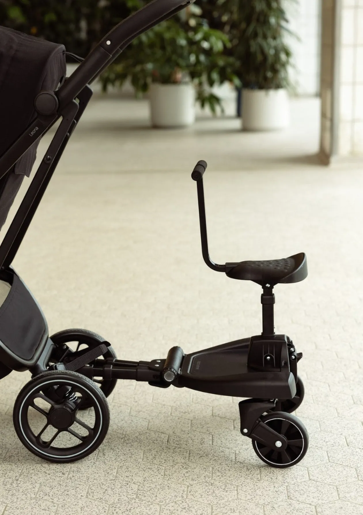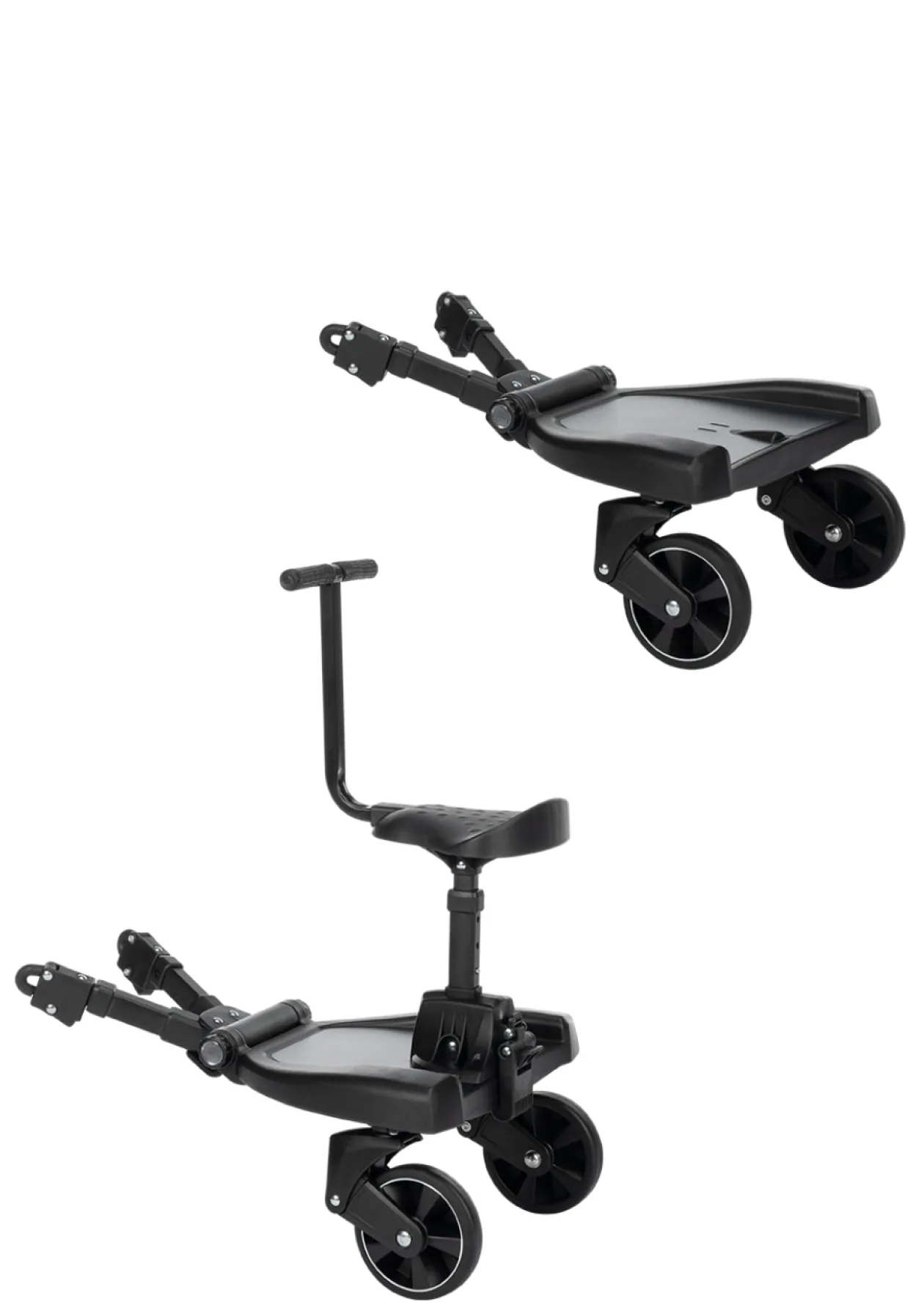 Mit diesem Mitfahrbrett wird dein Kinderwagen im Handumdrehen zum Gefährt für zwei: Während dein jüngstes Kind entspannt im Wagen liegt oder sitzt, kann das ältere Kind bequem mitfahren – entweder stehend oder sitzend. Perfekt für kurze Wege, längere Ausflüge oder müde Beinchen zwischendurch!
