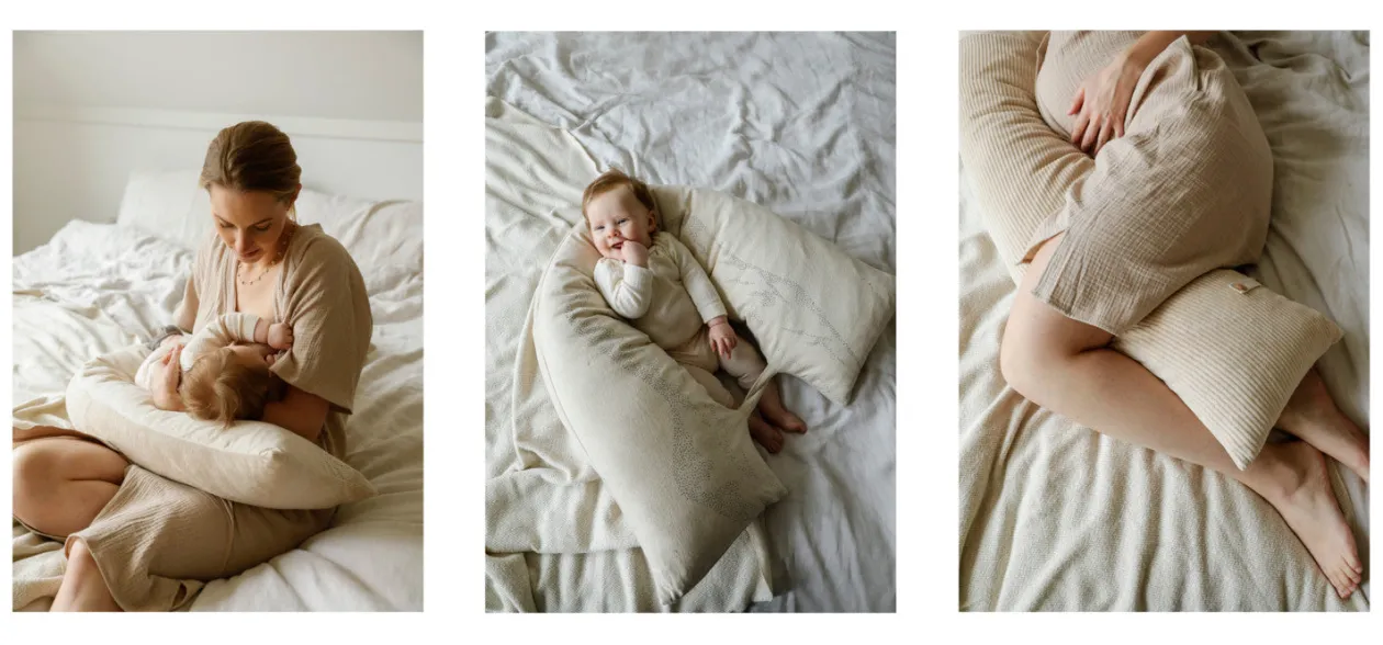 Dieses Stillkissen von NANAMI unterstützt dich bereits während und nach der Schwangerschaft! Es bietet unglaublich viele verschiedene Möglichkeiten und ist dank des angenehmen Stoffs ein Accessoire zum Wohlfühlen! In der Schwangerschaft hilft es dir eine angenehme Schlafposition zu finden, damit du wieder entspannt träumen kannst. Ist euer Baby da, kannst du es als Stütze beim Stillen verwenden, um deine Arme zu entlasten. Natürlich kann man sich auch wunderbar daran anlehnen oder es zusammen knöpfen und es für euer Baby in ein Nestchen voller Geborgenheit umwandeln.