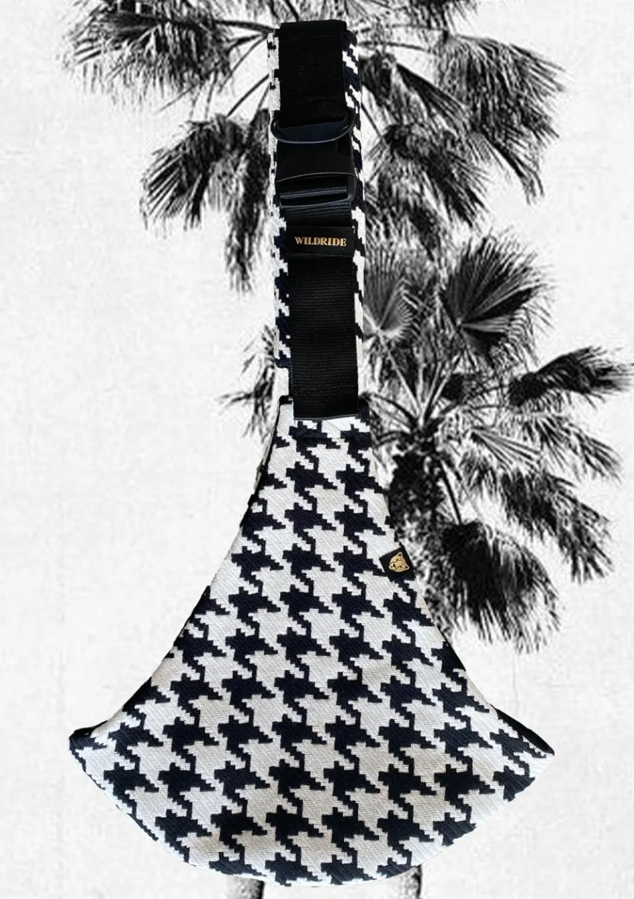 Die Premium Kindertrage von WILDRIDE vereint elegantes Design mit ergonomischem Komfort. Gefertigt aus hochwertigem Jacquard, ist das klassische Hahnentritt-Muster nicht gedruckt, sondern kunstvoll in den Stoff eingewebt – für einen besonders edlen und langlebigen Look.