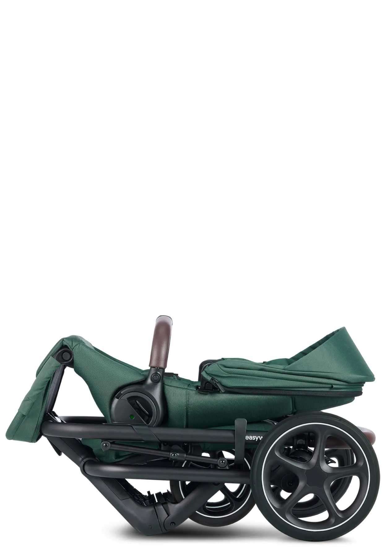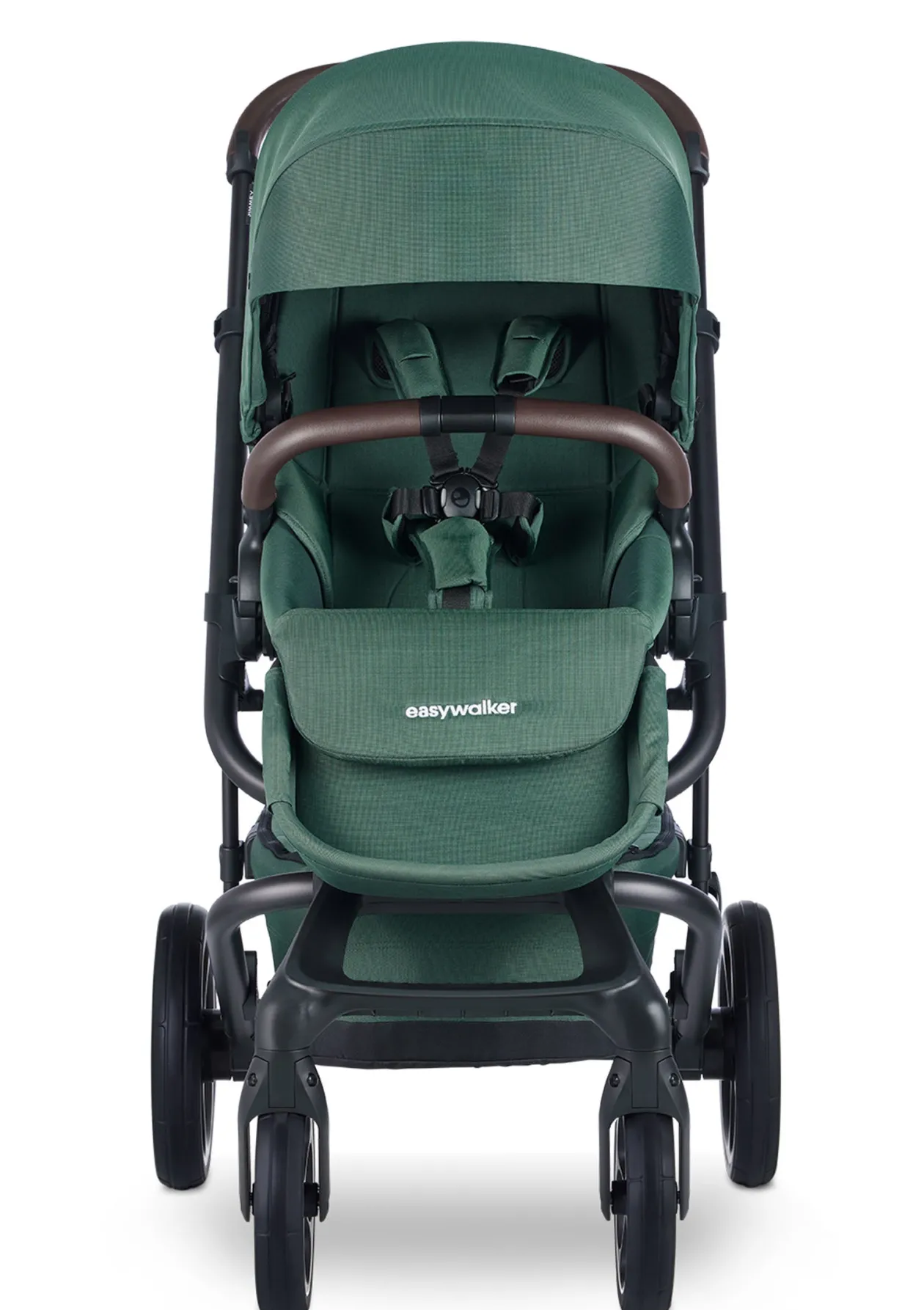 New in: Pine Green. Ein eleganter, tiefgrüner Stoff in Kombination mit einem glatten, braunen Schiebe- und Spielbügel.
