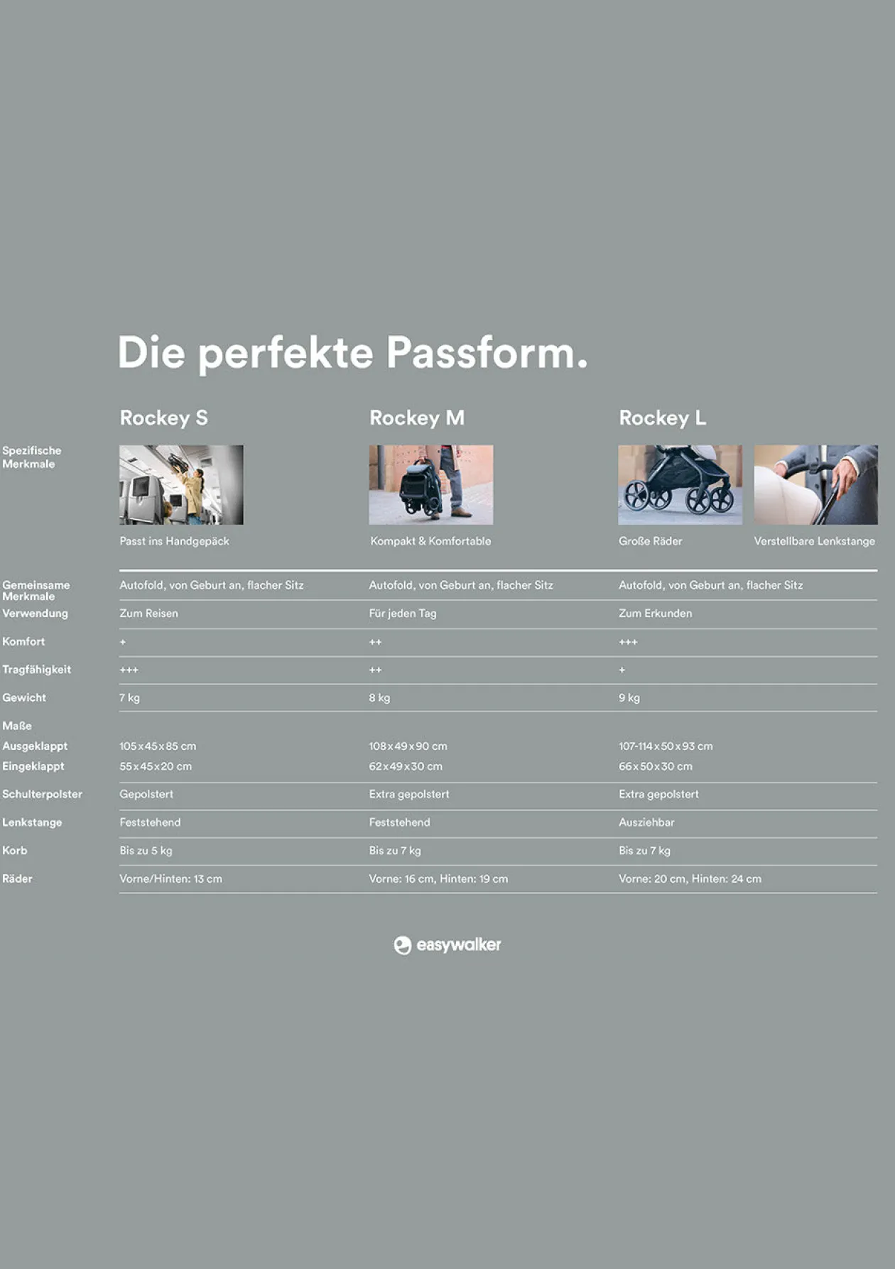 Rockey S, M oder L? Du wünschst dir einen Buggy, der perfekt zu deinem Lifestyle passt? Dann hat der niederländische Kinderwagen-Hersteller Easywalker die optimale Lösung für dich: Rockey. Diesen komfortablen Buggy gibt es nicht nur in verschiedenen eleganten Farben, auch die Größe variiert je nach gewünschter Verwendungsmöglichkeit. Du hast die Wahl zwischen Rockey S – perfekt zum Reisen, dem Stadtflitzer Rockey M oder dem geländegängigen All-Terrain-Buggy Rockey L. Finde die Passform, die euch perfekt ergänzt!