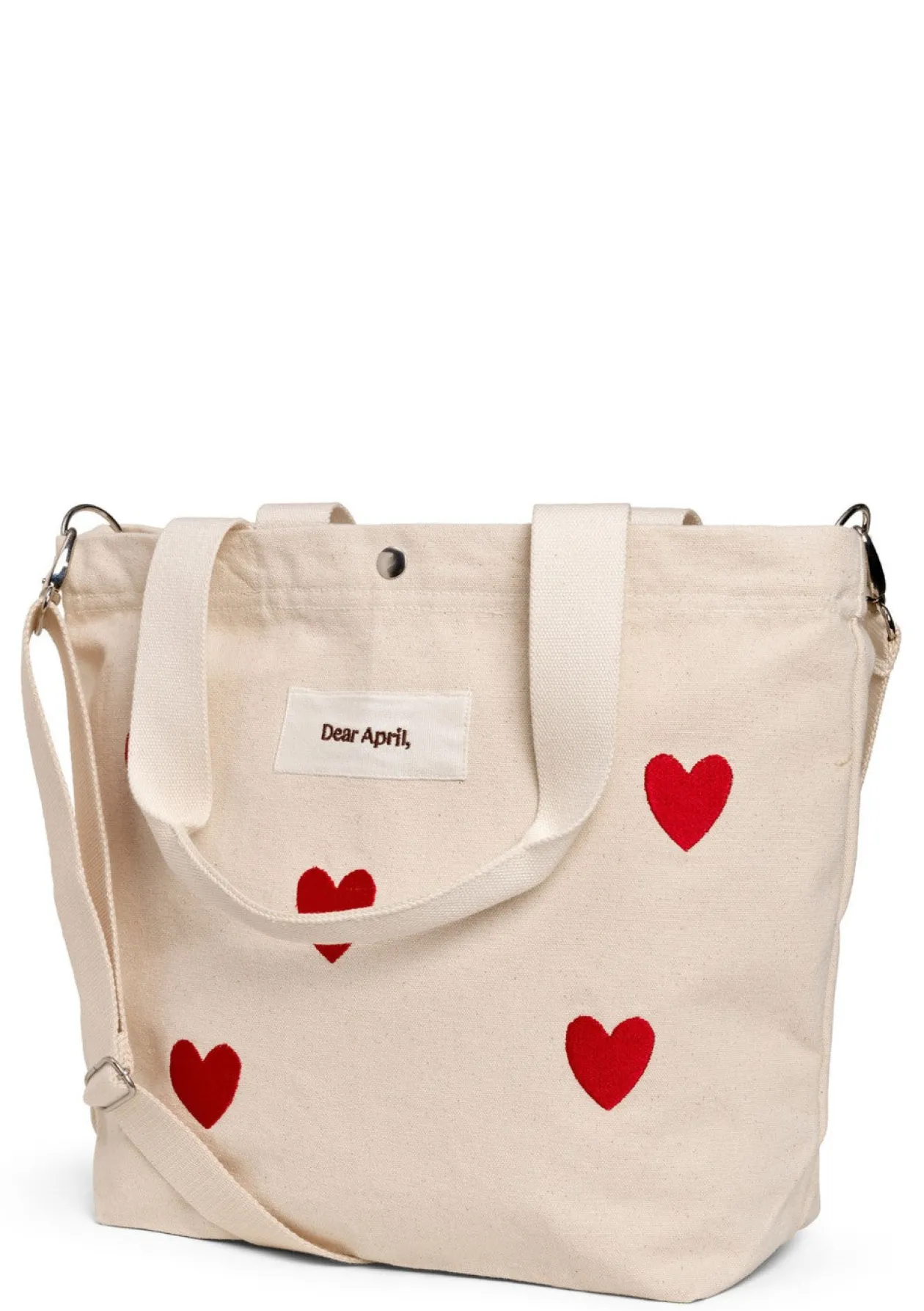 Dank zwei Tragegriffen und einem abnehmbaren Schulterriemen kannst du den Shopper flexibel und bequem tragen – so, wie es im Alltag gerade am besten passt. Bestickte rote Herzen, ein dekoratives Dear-April-Logo und matte Silberdetails verleihen der Tasche ihren eleganten, zeitlosen Look. Besonders praktisch: Die River Wickelunterlage passt perfekt hinein und macht den Shopper zu einem vielseitigen Begleiter für jeden Tag mit Baby.