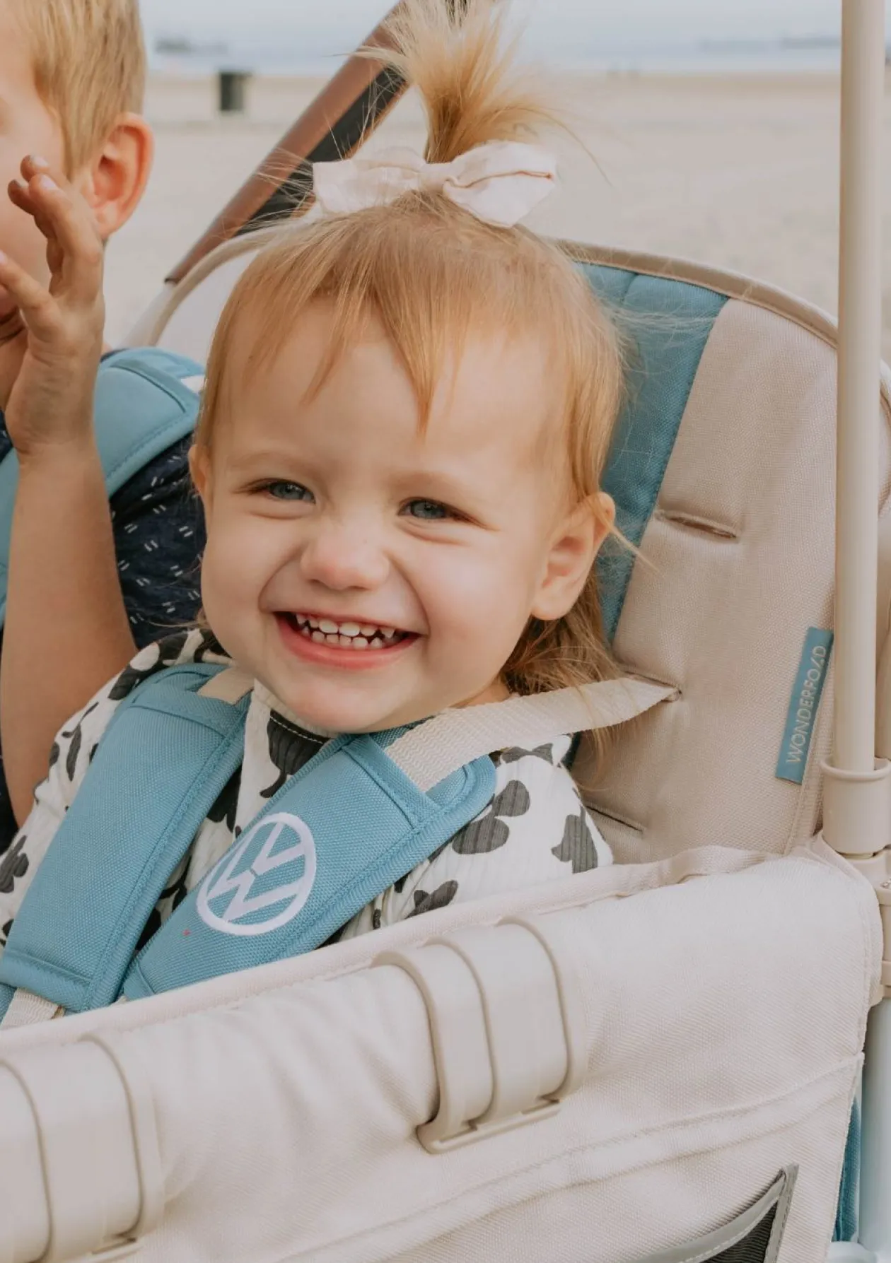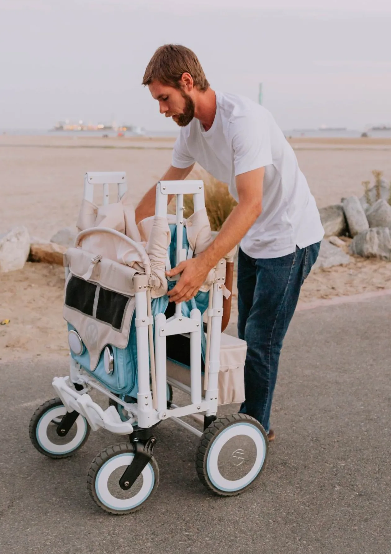 Inspiriert vom Oldtimer-VW-Bus zeigt sich dieser WonderFold VW4 Volkswagen Kinderwagen aus der Sonderedition in ganz besonderer Aufmachung. Das Modell verfügt über funktionale Merkmale wie die klassische VW-Stoßstange, leuchtende Scheinwerfer und Retro-Geländeräder im XL-Format. Das coole Gefährt bietet bis zu vier Kids eine bequeme Sitzgelegenheit. Der benutzerfreundliche Klappmechanismus ermöglicht eine unkomplizierte Mitnahme, langlebige und wetterfeste Materialien machen den VW-Bulli zu einem treuen Familienbegleiter, der jahrelangen Abenteuern standhält. Dank der robusten All-Terrain-Räder fährt er sich auf belebten Straßen in der City genauso gut wie auf ruhigen Pfaden in der Natur. Eine wunderbare Anschaffung für bleibende Kindheitserinnerungen!