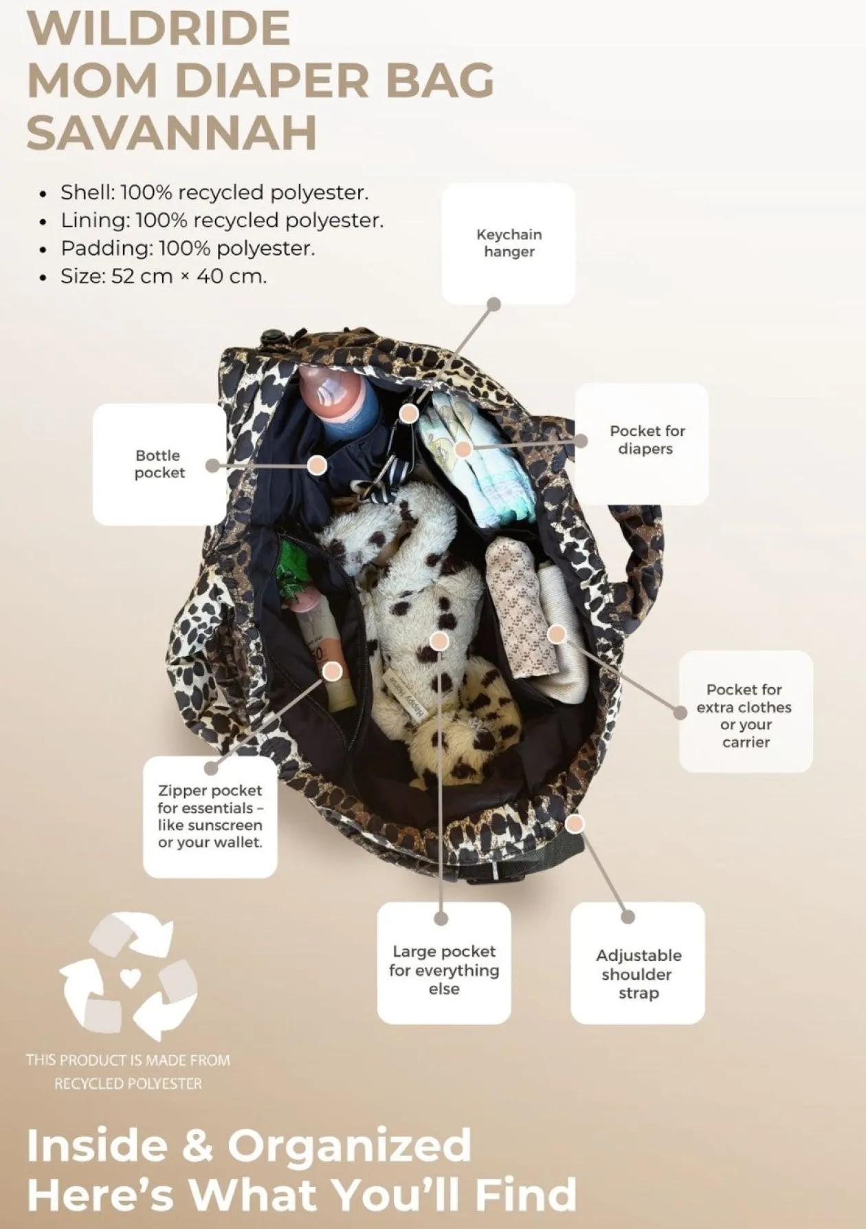 Das robuste Material aus recyceltem Polyester macht die Tasche besonders langlebig und nachhaltig. Der breite, bequeme Schulterriemen sorgt für hohen Tragekomfort – alternativ kannst du die Tasche unkompliziert am Kinderwagengriff befestigen. Mit ihrem eleganten Leo-Look setzt du außerdem ein modisches Statement, das auch ohne Kinderwagen überzeugt.