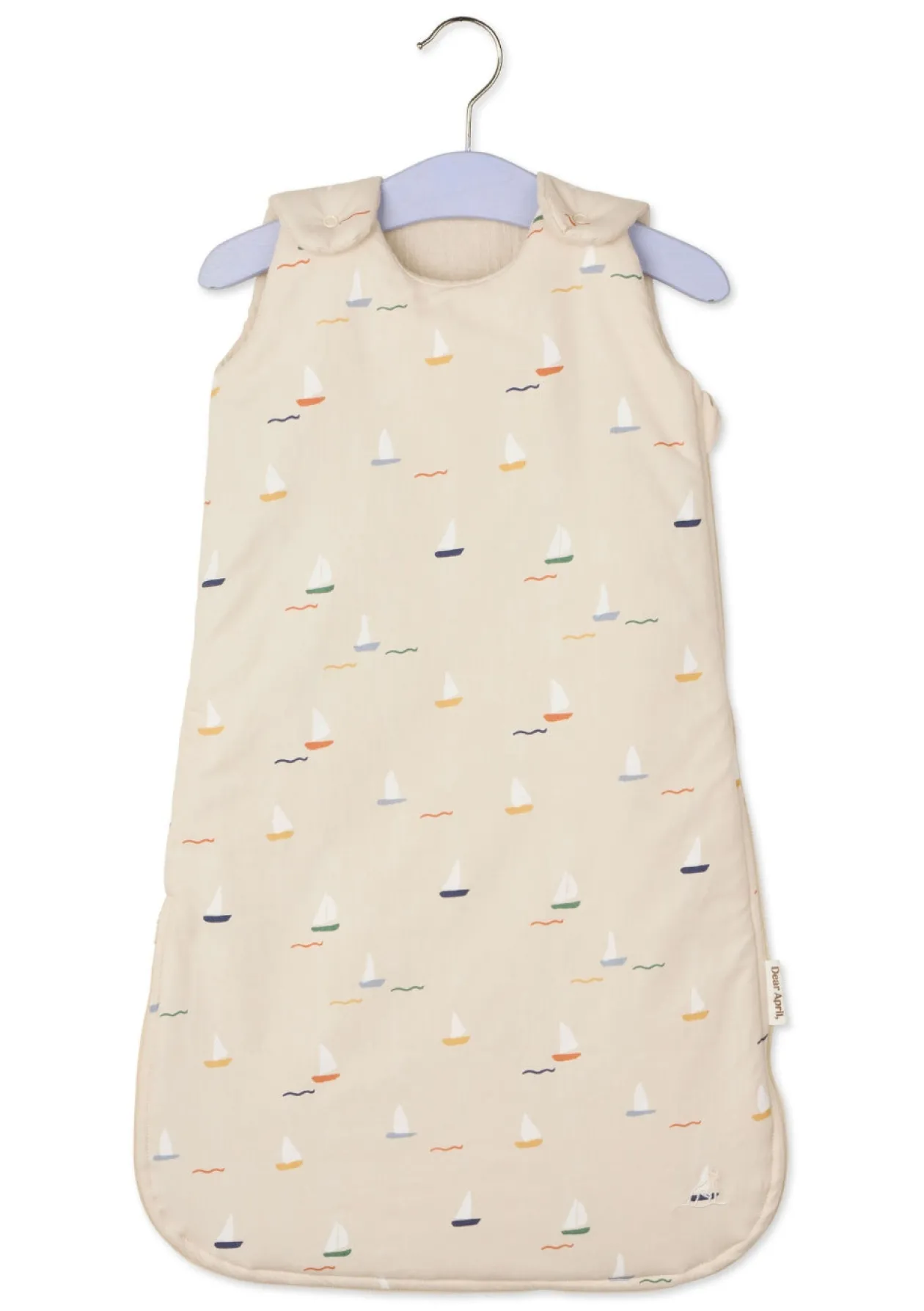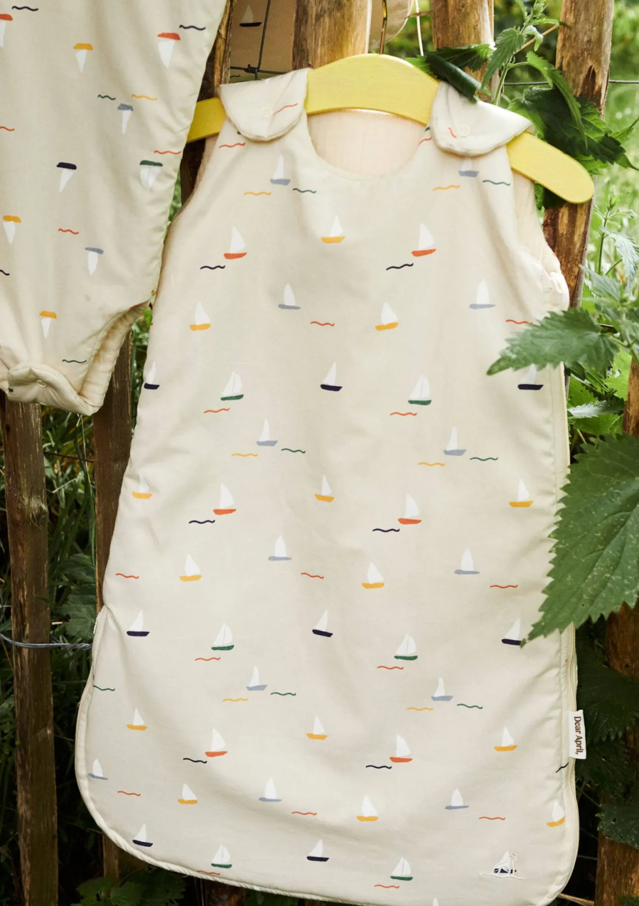Der Winterschlafsack Wind von der Marke DEAR APRIL verzaubert mit maritimen Dessin: Ein kleines Boot, das vom Wind getragen übers Wasser gleitet – der Pond Boats-Druck fängt diese zeitlose Magie und kindliche Abenteuerlust ein.