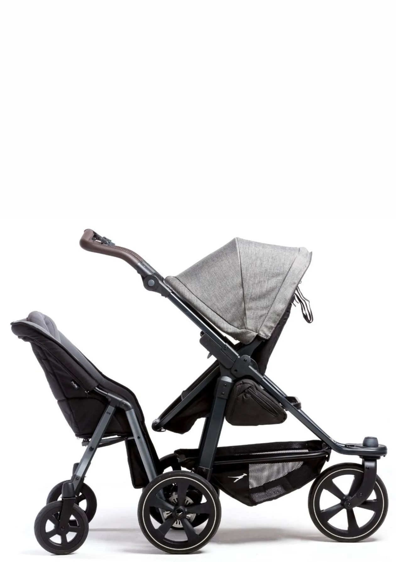 Bequemer geht es kaum: In diesem innovativem Zweitsitz kann das ältere Geschwisterchen Platz nehmen und mitfahren. Auf diese Weise ermöglicht der TFK ‚Shuttle‘ den angenehmen Transport von zwei kleinen Kindern ohne Geschwisterwagen. Durch die hohe Rückenlehne und das weiche Kopfpolster erlebt auch das ältere Kind höchsten Fahrkomfort. Der weite Radstand stellt ein angenehmes Schieben sicher.