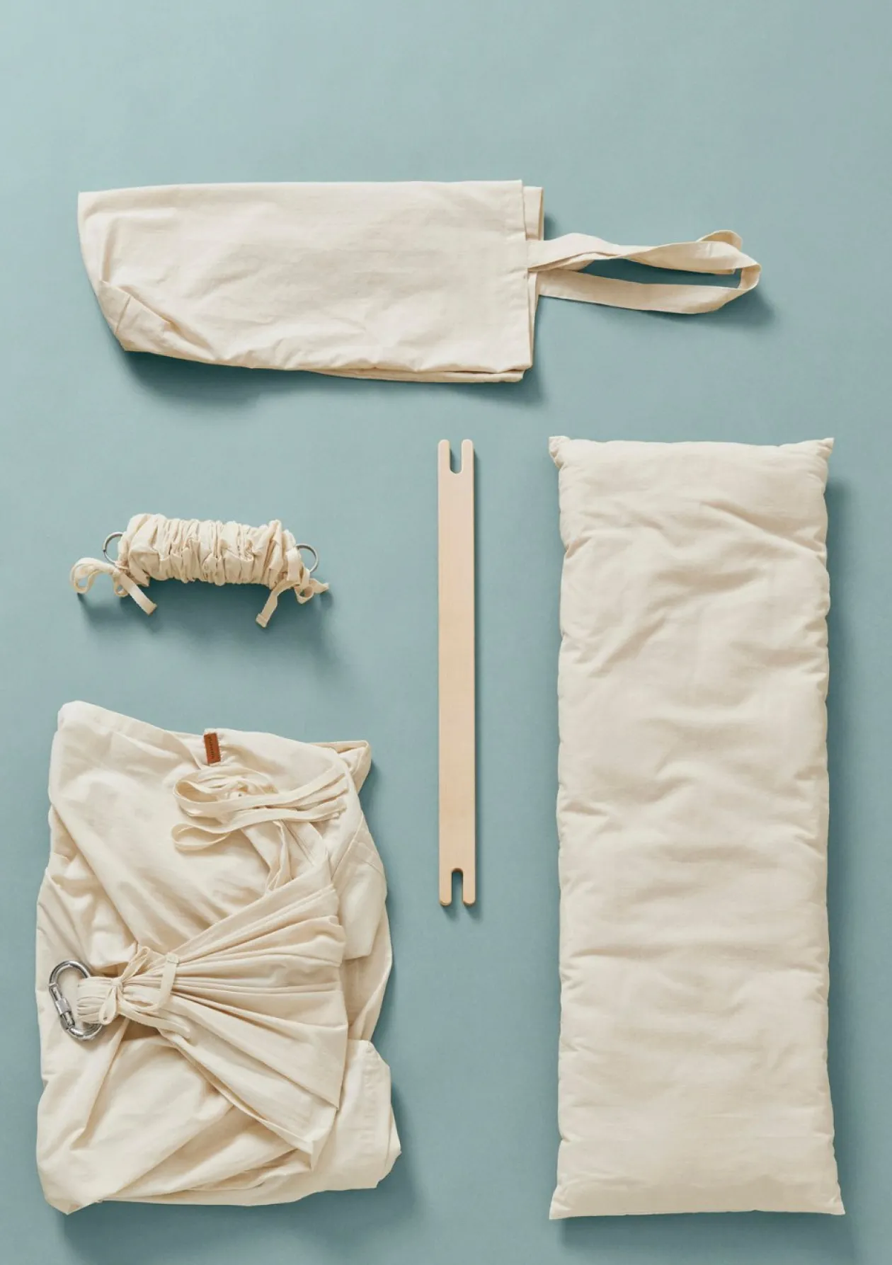 - Federwiege aus ökologischer Baumwolle inkl. Querstange, Feder mit Sicherungsgurt, Stoffbeutel, Matratze mit abnehmbarem Bezug, Spannbettlaken, Karabiner mit Schraubverschluss und Gummiisolierung