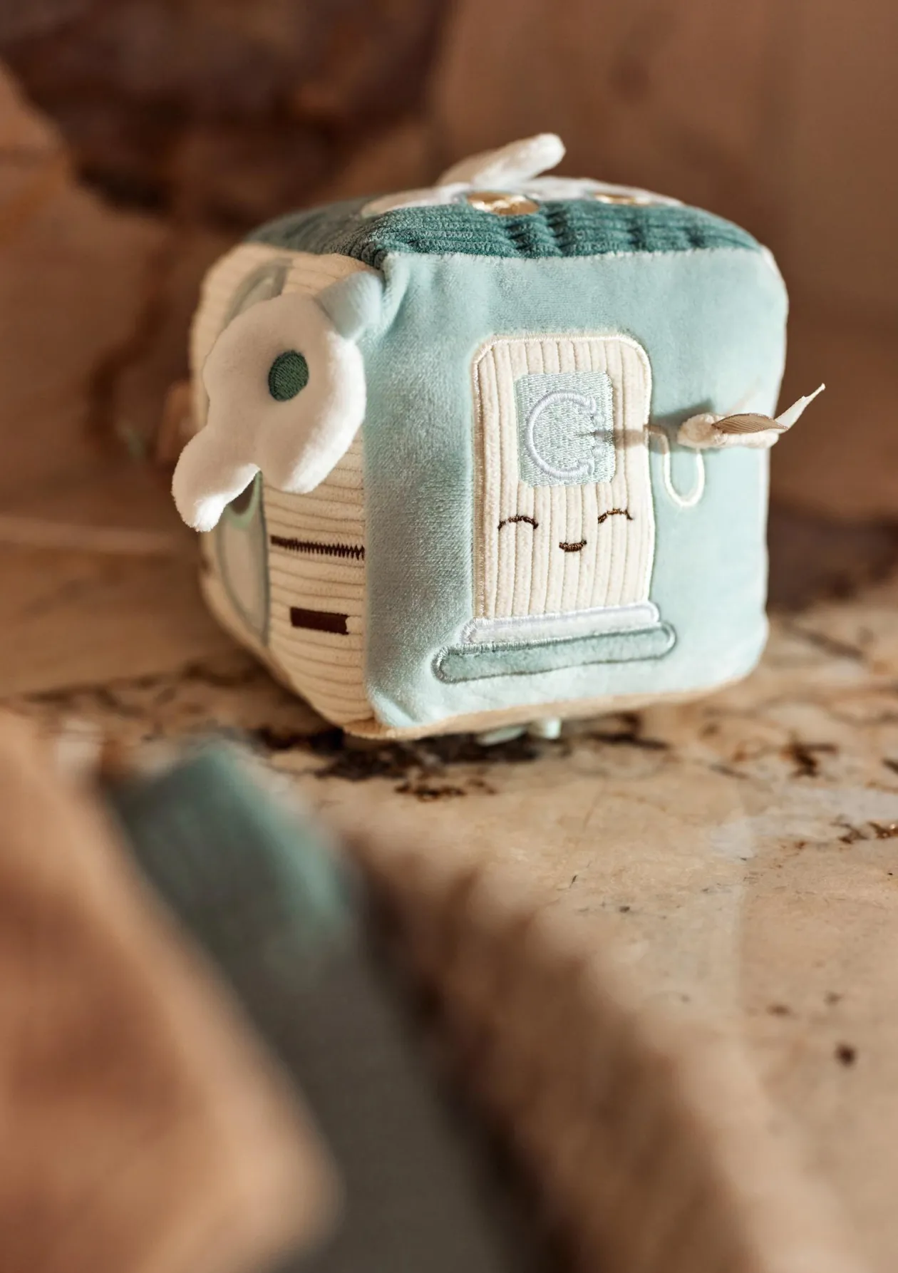 Knisterfolien, ein kleiner Spiegel, bunte Schlaufen und niedliche Fahrzeuge machen diesen weichen Würfel zu einem echten Erlebnis für kleine Entdecker – zu Hause, im Laufstall oder unterwegs im Kinderwagen. Ein liebevolles Geschenk zur Geburt, das lange begeistert.