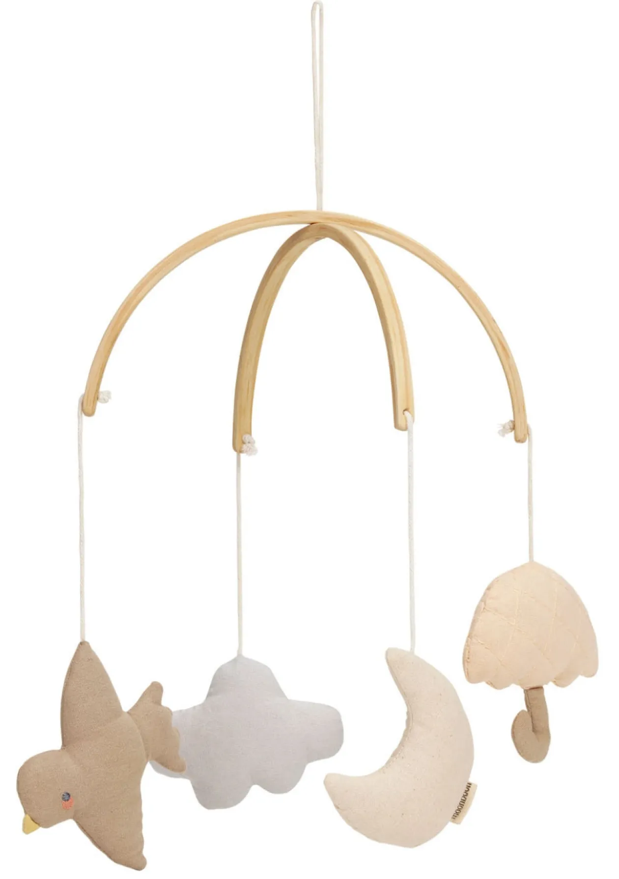 Sanfte Bewegungen, liebevolle Details und ein Hauch von Märchenmagie – dieses stimmungsvolle Baby-Mobile von MOONBOON lädt dein Baby zum Staunen und Träumen ein. Inspiriert von Hans Christian Andersens Märchen „Ole Lukøje“, in dem der Sandmann Kindern süße Träume schenkt, schafft das Mobile eine harmonische Atmosphäre im Kinderzimmer. Filigrane Elemente aus zertifizierter Bio-Baumwolle schweben schwerelos durch den Raum und fördern spielerisch die visuelle Wahrnehmung. Ob über dem Bettchen, der Wiege oder der Federwiege – das stilvolle Mobile fügt sich mühelos in jede Umgebung ein. Die dezenten, natürlichen Farben wirken beruhigend und machen das Mobile zu einem echten Blickfang mit zeitloser Eleganz.