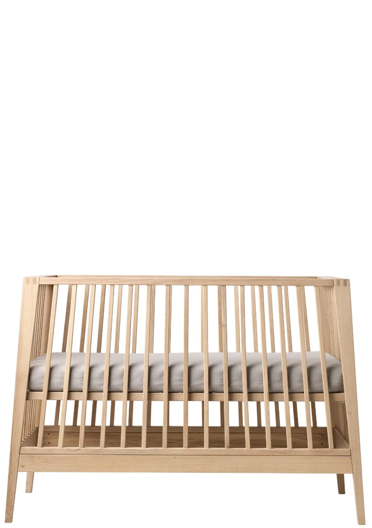 Die hochwertige Verarbeitung aus massivem Eichenholz macht das Babybett nicht nur zu einem stabilen und langlebigen Begleiter, sondern auch zu einem ästhetischen Möbelstück. Die markante Linienführung und die leicht ausgestellten Beine sorgen für eine elegante, zeitlose Anmutung, die den natürlichen Charakter des Holzes perfekt unterstreicht.