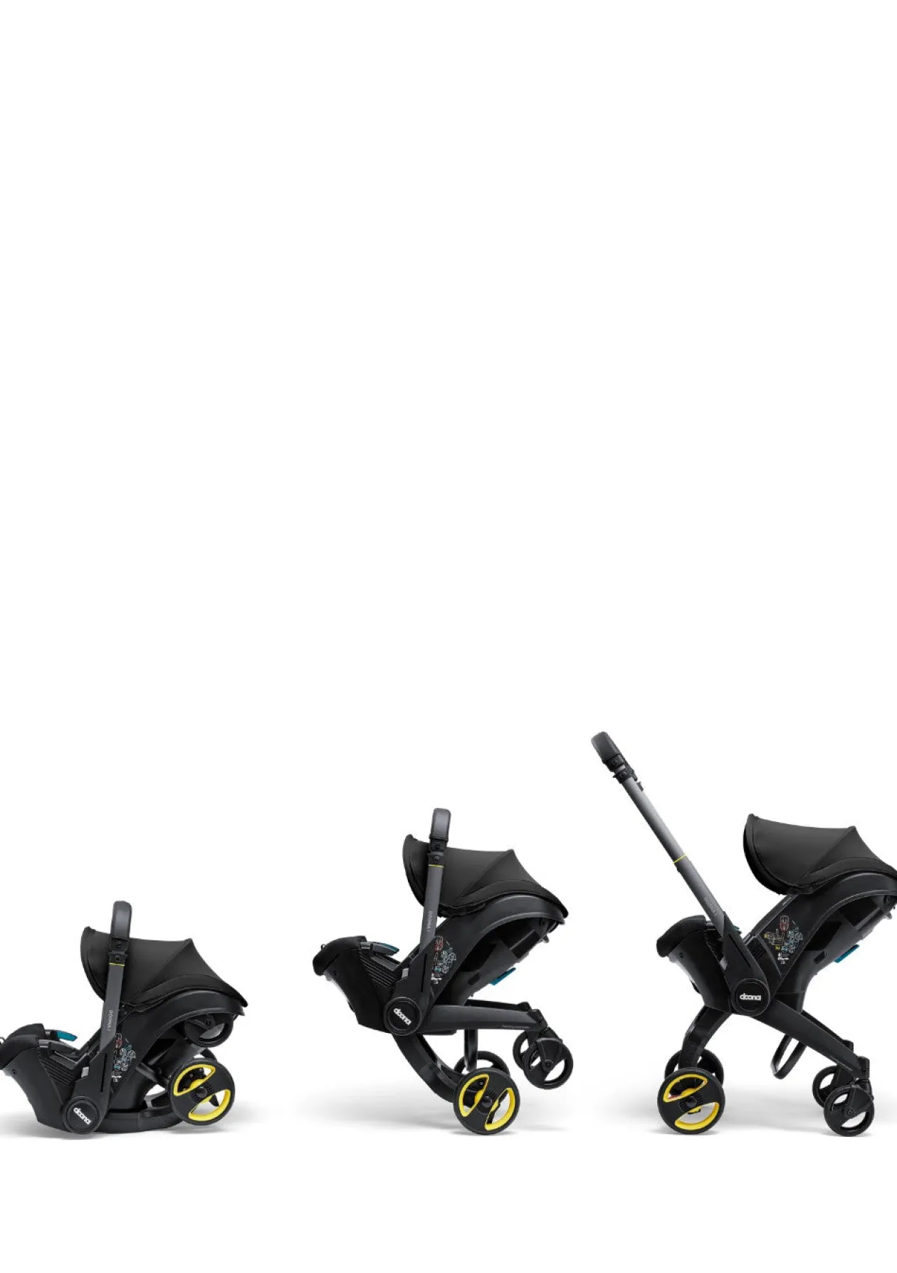 Wichtiger Hinweis: Sie müssen alle Taschen aus der Doona i entfernen, bevor Sie die Räder zusammenklappen und in den Autositzmodus wechseln.