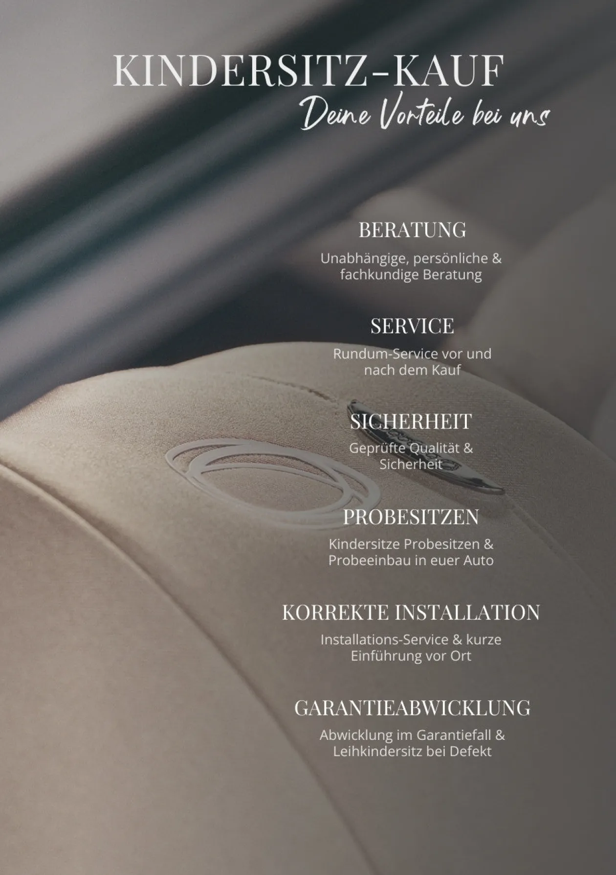 Seit Einführung der i‑Size-Norm sind unsere Kindersitze in der Regel mit den meisten modernen Fahrzeugen kompatibel. Wenn ihr ein besonders großes Fahrzeug, einen Van oder Bus fahrt oder ein Auto ohne i‑Size‑gekennzeichnete Sitzplätze nutzt, empfiehlt es sich, vorab per E‑Mail, telefonisch oder direkt vor Ort Rücksprache mit einem unserer Fachgeschäfte zu halten. Ein gemeinsamer Testeinbau in euer Fahrzeug ist jederzeit möglich, um die Kompatibilität zu prüfen und maximale Sicherheit zu gewährleisten.