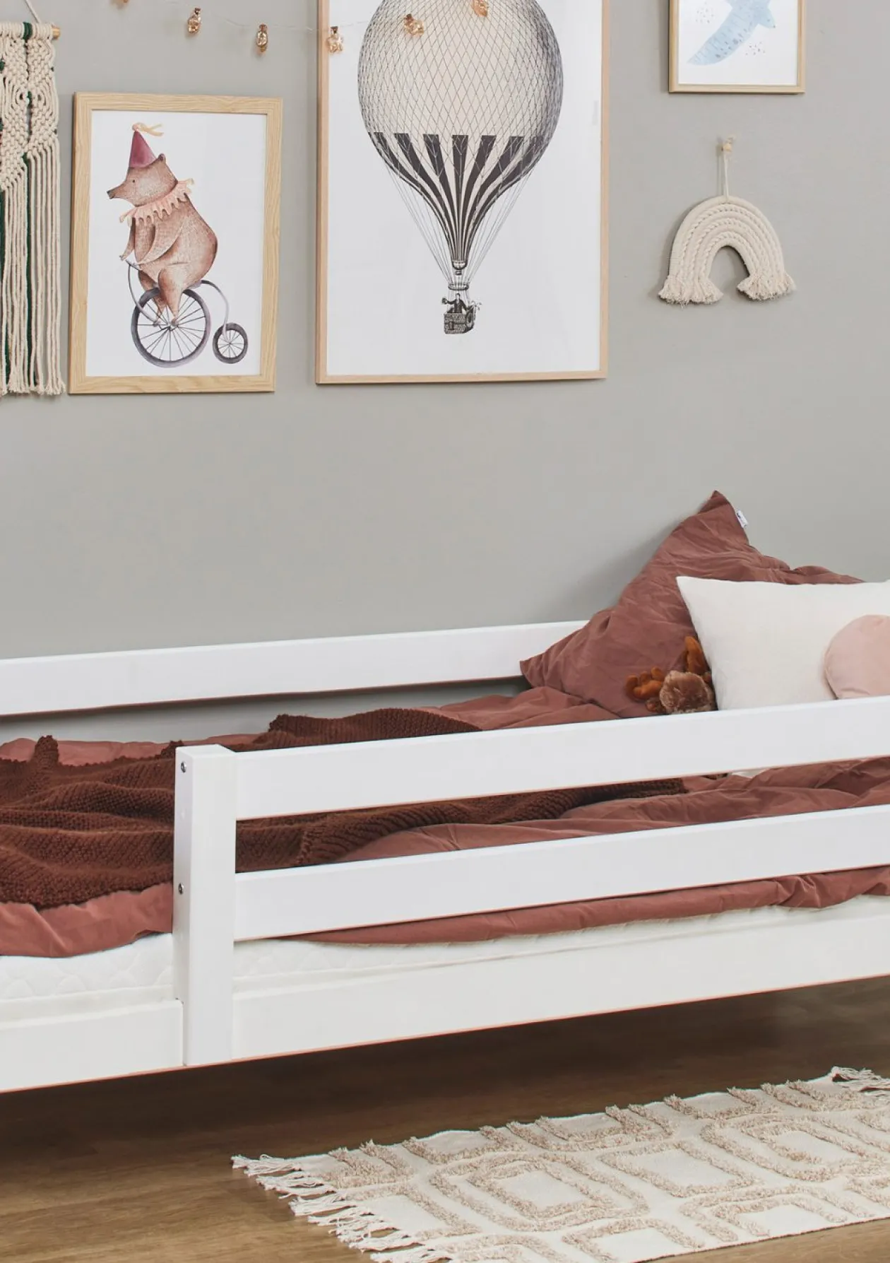 - je nach Alter des Kindes/Sicherheitsbedürfnis optional mit einem Bettschutzgitter in verschiedenen Größen erhältlich: ohne Rausfallschutz, mit kleinem oder großem Rausfallschutz (bitte geeignete Variante auswählen!)