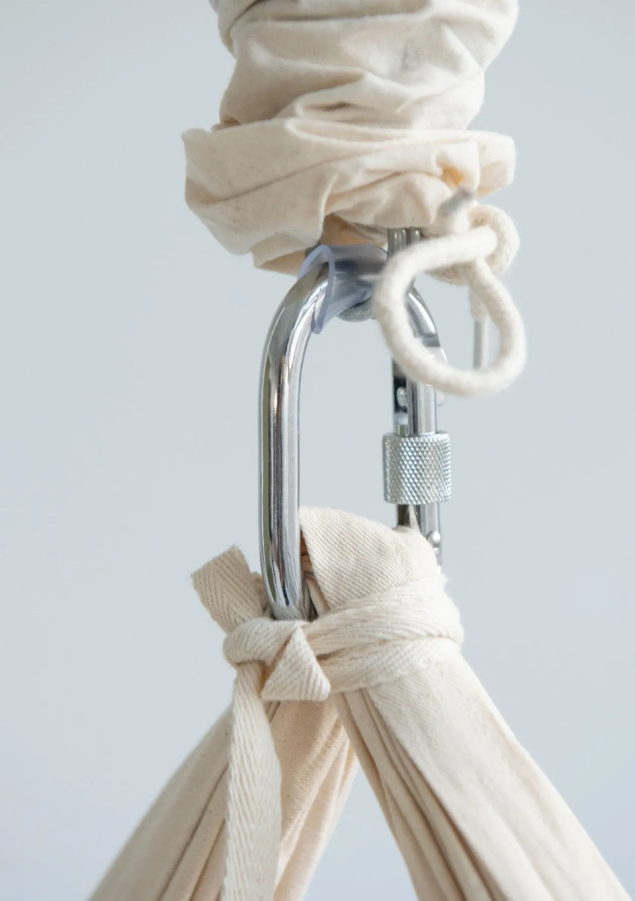 - Wenn Metall auf Metall trifft, können Metallstaub und Metallsplitter entstehen. Achten Sie deshalb darauf, dass der Stoffbeutel oberhalb der Feder befestigt ist und die Feder und den kleinen Karabinerhaken bedeckt.
