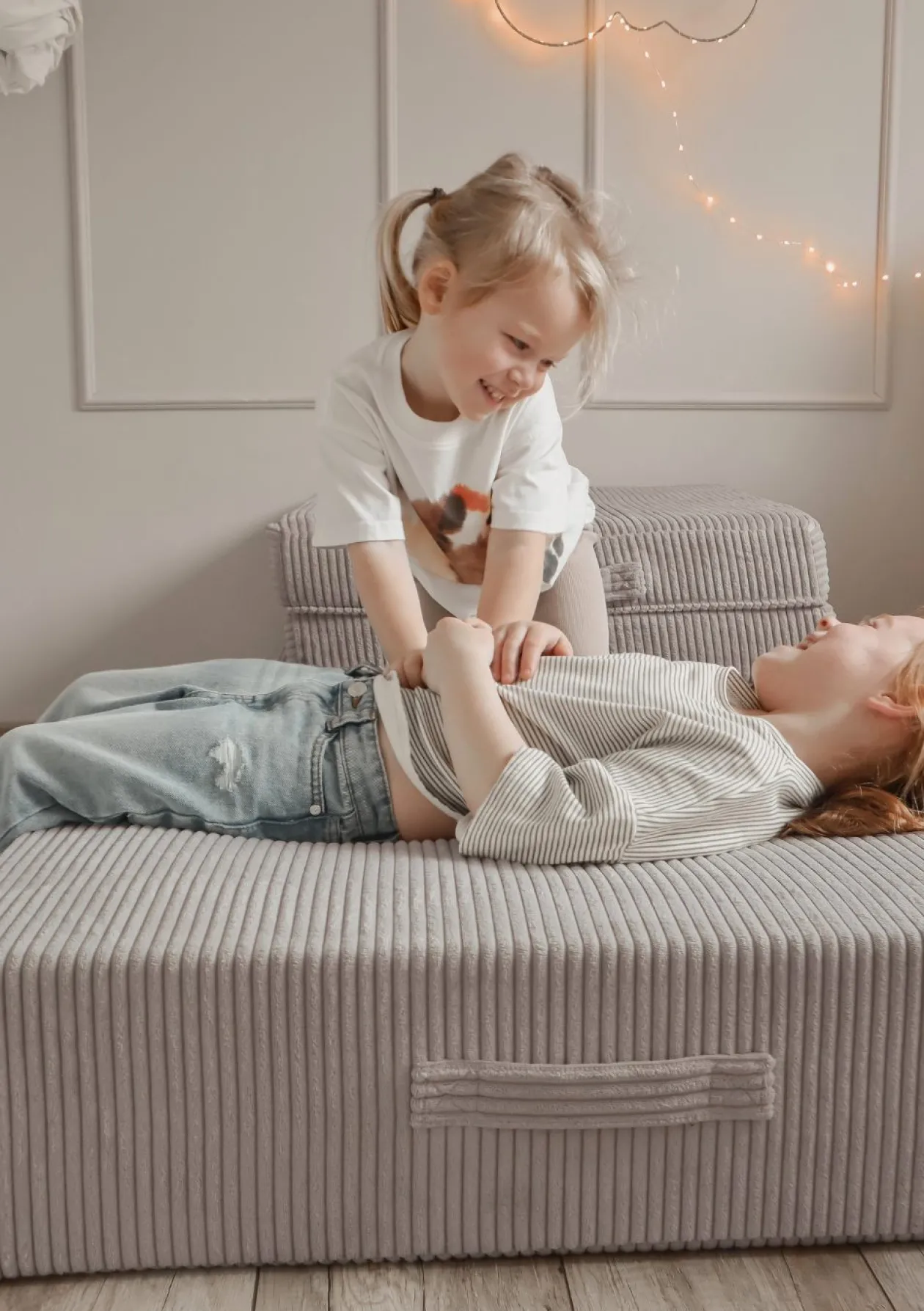 Toben, springen, träumen: Mit diesem coolen Polstermöbel verwandelst du das Kinderzimmer in einen Ort voller Lachen, Spielspaß und Gemütlichkeit. Entwickelt für kleine Energiebündel greift die federnde Hüpfmatte den natürlichen Bewegungsdrang von Kindern auf und unterstützt die Entwicklung von Koordination und Körperbeherrschung. Der hochwertige Kern aus PUR-Schaumstoff mit integriertem Taschenfederkern bietet die ideale Kombination aus Komfort und Sprungkraft und sorgt dafür, dass das Polster jede Menge Tobespaß aushält. Alternativ fungiert es aber auch als bequemes Sitzmöbel zum Kuscheln und Relaxen. Der weiche, strapazierfähige Cordbezug fühlt sich super angenehm an und lässt sich ganz unkompliziert in der Waschmaschine reinigen – perfekt für den turbulenten Familienalltag. Ob als Erweiterung zum legendären Funzy Spielsofa oder als flexibler Solo-Künstler, das formstabile Hüpfpolster bringt Freude, Bewegung und Stil in dein Zuhause.
