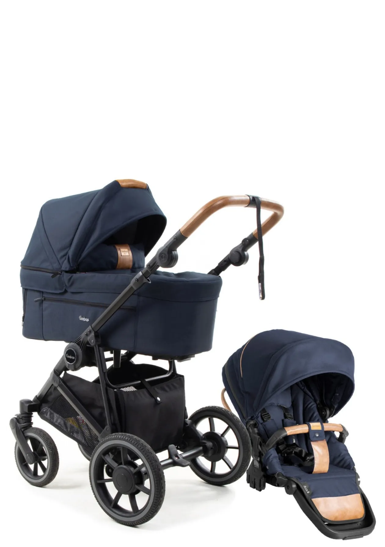 - Die Outdoor-Variante ist mit braunen, lederähnlichen Akzenten aus pflegeleichtem Leatherette gestaltet und verleiht dem Kinderwagen einen robusten, naturnahen Look.