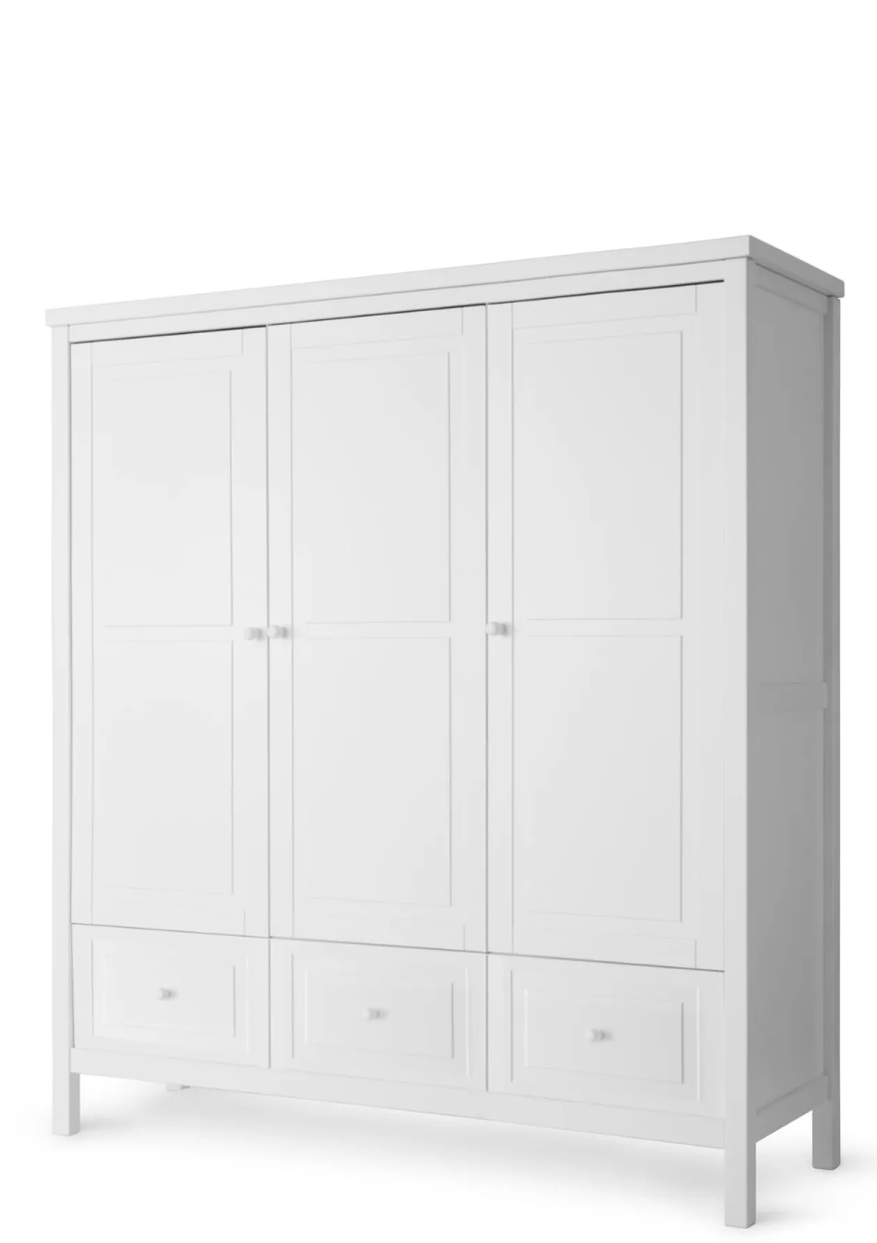 Ob Baby-, Kinder- oder Jugendzimmer – dieser schlicht gestaltete Kleiderschrank schafft ein freundliches Ambiente und fügt sich in monochromer Aufmachung nahtlos in jedes Zuhause ein. Im geräumigen Inneren bietet euch der türige Schrank ganz viel Platz für Kleidung, Schuhe, Accessoires und mehr. Die clever durchdachte Innenaufteilung – mit zwei Kleiderstangen und acht flexibel einstellbaren Einlegeböden – macht Ordnunghalten zum Kinderspiel. Zusätzlichen Stauraum hält eine Schublade im unteren Teil des Schranks bereit. Die drei leichtgängigen Türen mit hochwertigen Scharnieren schließen sanft und nahezu geräuschlos. Die ergonomisch geformten Holzgriffe sind speziell für Kinderhände gestaltet und ermöglichen den Kleinen ein müheloses Öffnen und Schließen. Der funktionale Kleiderschrank gewährleistet euch die Flexibilität, die ihr in den verschiedenen Wachstumsphasen deines Kindes benötigt. Denn das Modell ist darauf ausgelegt, sich den sich ändernden Bedürfnissen immer wieder anzupassen und wird so zum jahrelangen Begleiter.