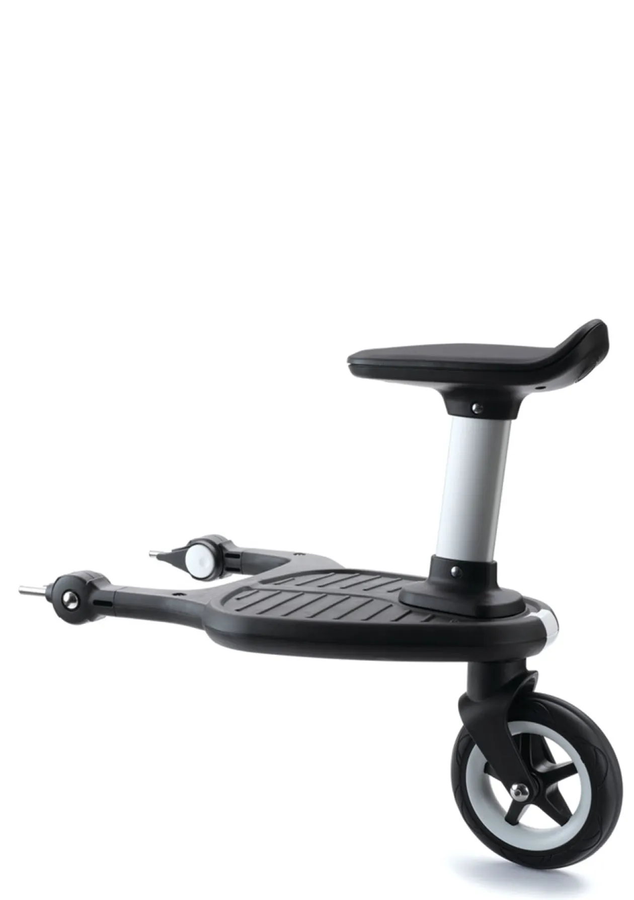 Das Mitfahrbrett Komfort+ von BUGABOO macht eure Ausflüge mit zwei Kindern besonders flexibel! Während das kleine Kind die Fahrt im Kinderwagen genießt, darf das Geschwisterkind auf das Mitfahrbrett steigen. Sollten die kleinen Beine doch mal müde werden, könnt ihr schnell und einfach den Sitz des Mitfahrbretts aufstecken und die Fahrt geht bequem im Sitzen weiter. Das gefederte Schwenkrad sorgt dabei immer für eine komfortable Fahrt. Mit nur einem Klick ist das Brett installiert. Ihr könnt wählen, ob das Brett mehr nach links oder rechts versetzt montiert wird, damit ihr genügend Beinfreiheit zum Schieben habt, ohne mit Füßen dagegen zu stoßen. Die Möglichkeit, das Mitfahrbrett ohne Passagier nach oben zu klappen oder einfach abzumontieren und im Korb des Kinderwagens zu verstauen, macht die Nutzung so bequem wie möglich!
