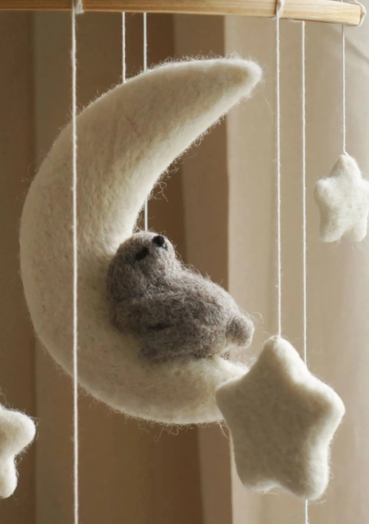 Ein auf dem Mond schlafender Hase und kleine Filzsterne, die sanft im Raum schweben – diese Mobile bringt Ruhem, Natürlichkeit und einen Hauch Magie ins Kinderzimmer und hilft beim Beruhigen und Einschlummern.