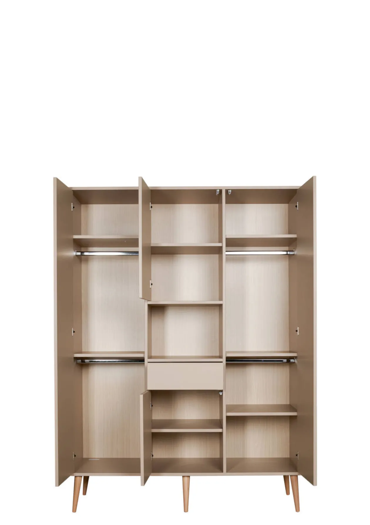 - Sieben variable Einlegeböden, zwei Kleiderstangen und ein offenes Fach