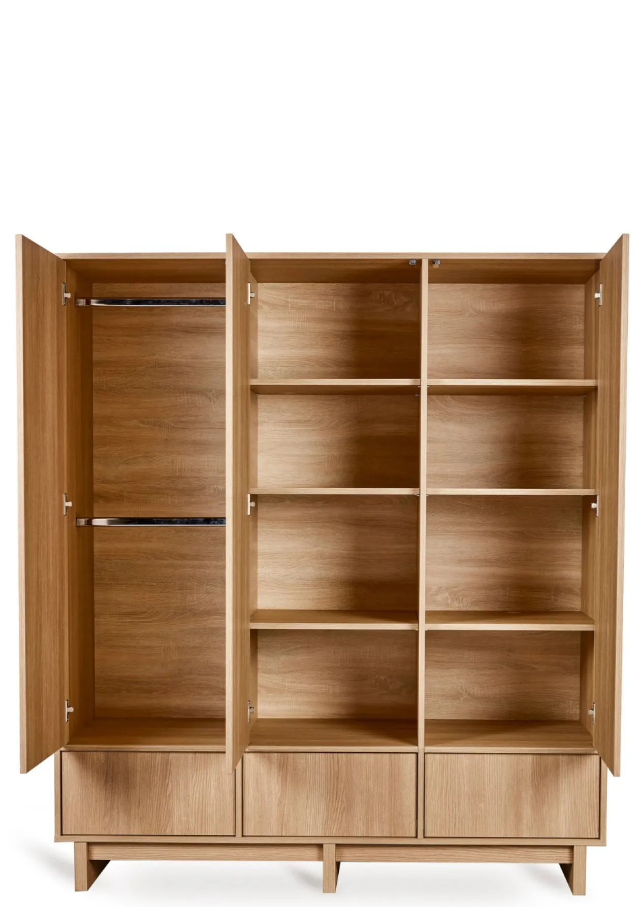 Dieser extra große Kleiderschrank mit drei Türen vereint ästhetisches Design mit durchdachter Funktionalität. Inspiriert von skandinavischer Schlichtheit und japanischer Ruhe bringt er Ordnung und Harmonie in dein Zuhause – mit klaren Linien, warmen Holznuancen und einer beruhigenden, aufgeräumten Optik.