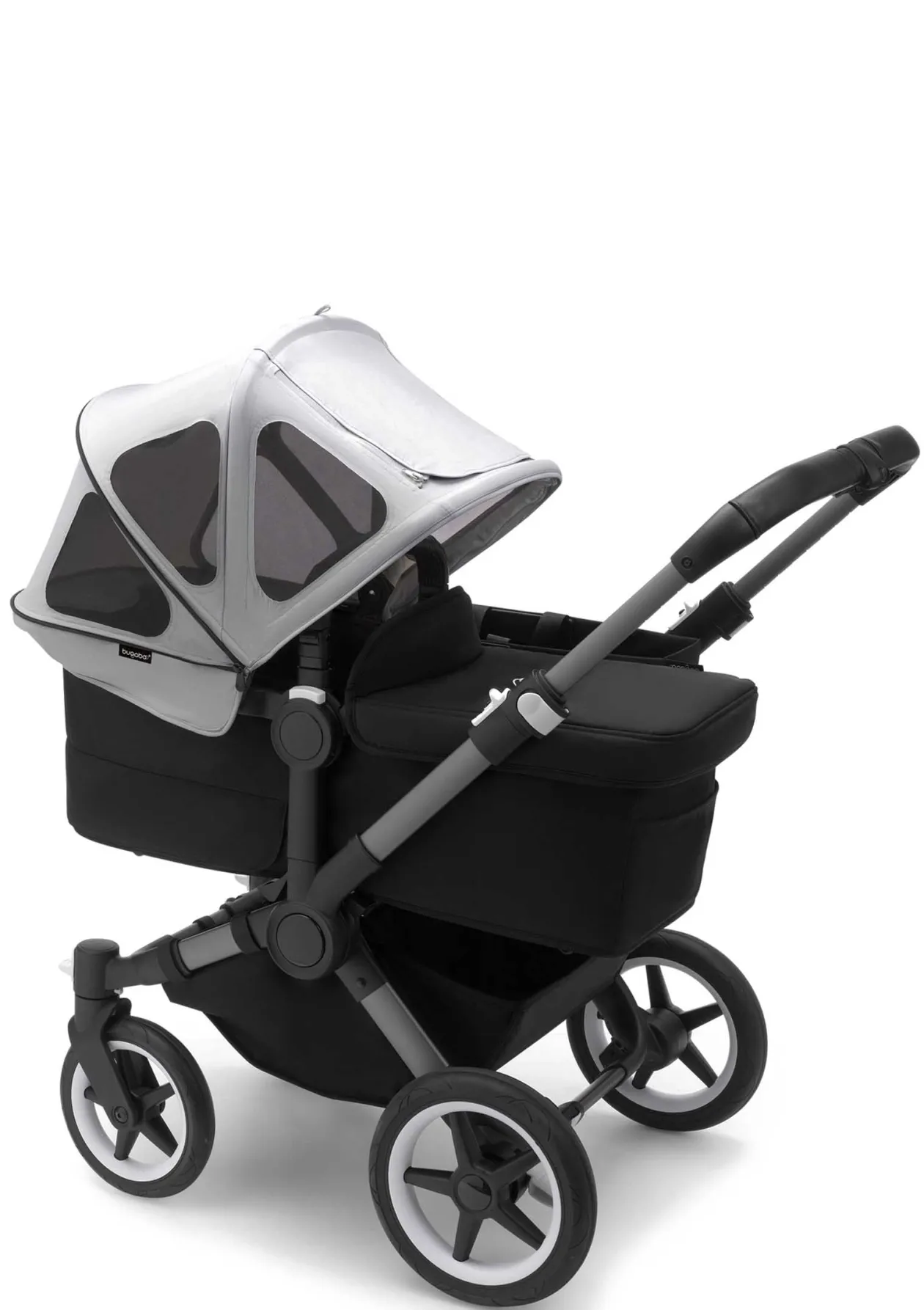 Bitte beachte: Die Sonnendachstreben und Befestigungsklemmen sind nicht im Lieferumfang enthalten. Sie sind separat erhältlich oder können von deinem anderen Bugaboo Sonnendach wiederverwendet werden. Der auf dem Produktfoto abgebildete Kinderwagen ist separat erhältlich.