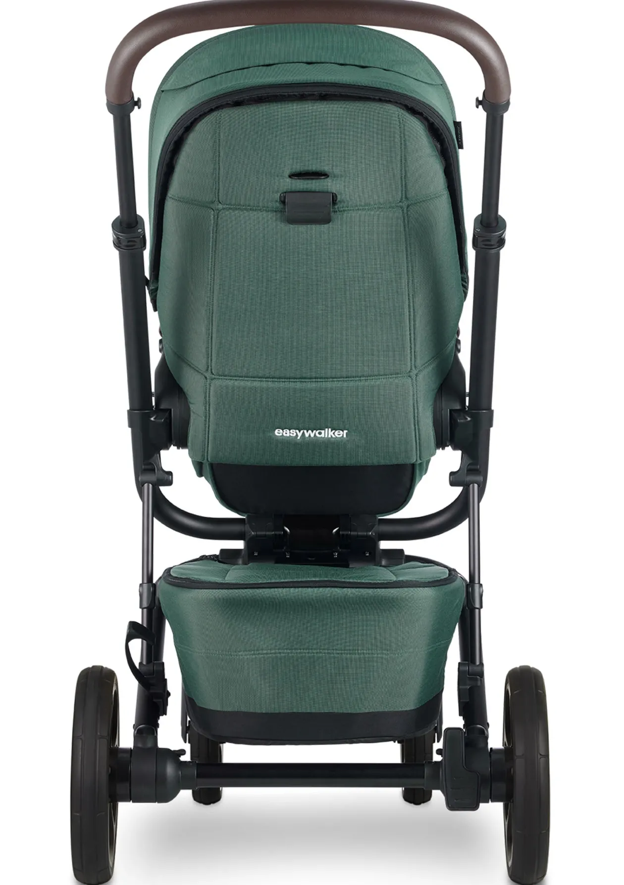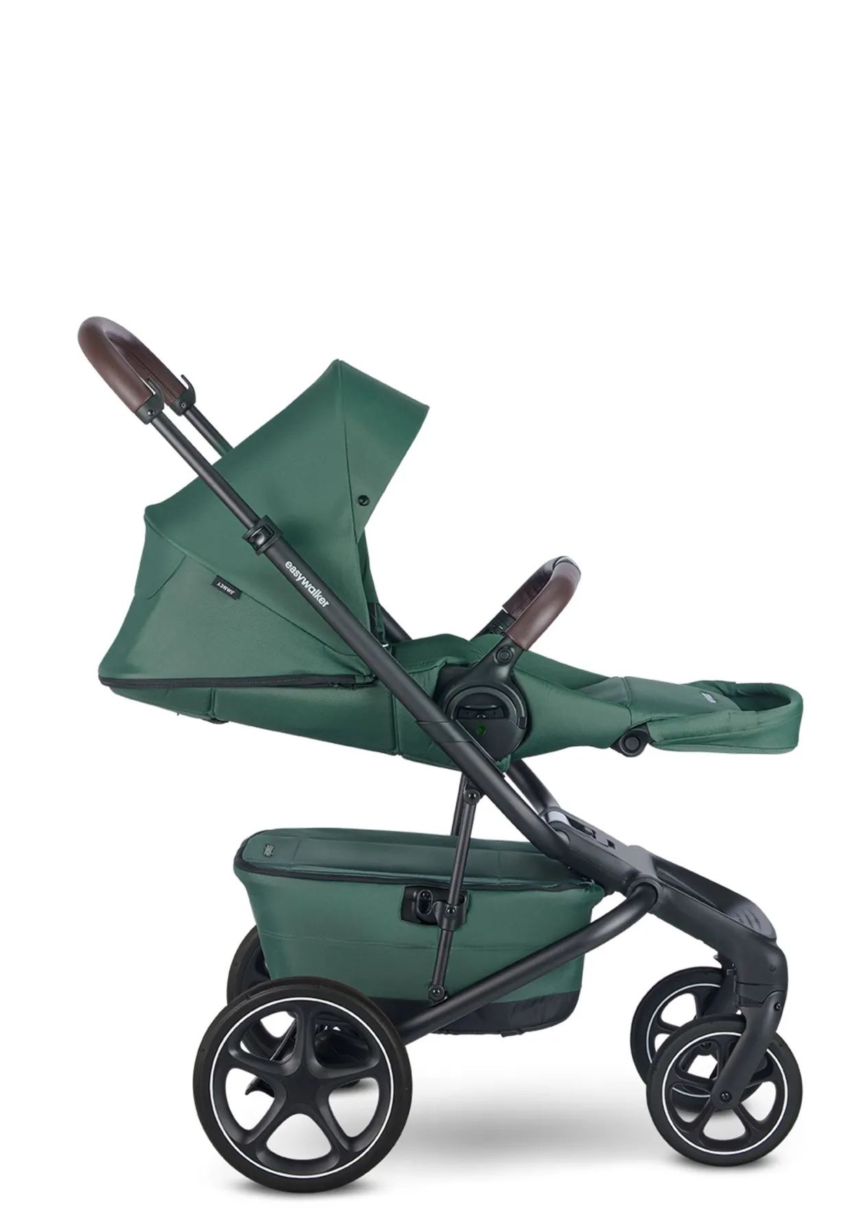 New in: Pine Green. Ein eleganter, tiefgrüner Stoff in Kombination mit einem glatten, braunen Schiebe- und Spielbügel.
