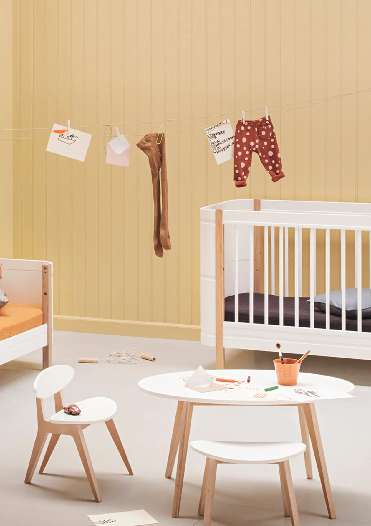 Der Einklang aus nordischer Eiche und glänzend weißer Lackierung machen dieses Möbelstück in jedem Kinderzimmer zur Attraktion. Er passt sich in die meisten Kinderzimmer problemlos ein und ist die perfekte Sitzfläche, auf der sich dein Kind beim Spielen, Malen oder Schreiben an einen Tisch setzen kann.