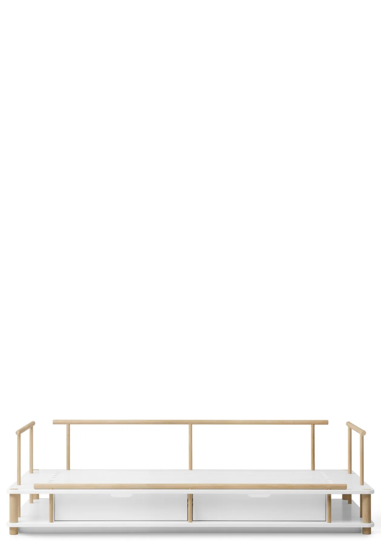 Die typischen Linien des Himmelbetts bleiben dabei erhalten. Das Bettsofa überzeugt mit seinem niedrigen Rahmen aus elegant geformten Eichenrundstäben an den Seiten und der Rückenlehne, dezent verdeckten Schrauben und kann bei Bedarf mit separat erhältlichen Schubladen für stilvollen Stauraum ausgestattet werden. Mit Kissen, Decken oder Plaids lässt es sich im Handumdrehen in eine gemütliche Sofalandschaft verwandeln. Ein vielseitiges Möbelstück, das Funktionalität und Design vereint – und das Kinderzimmer um ein charmantes Highlight bereichert.