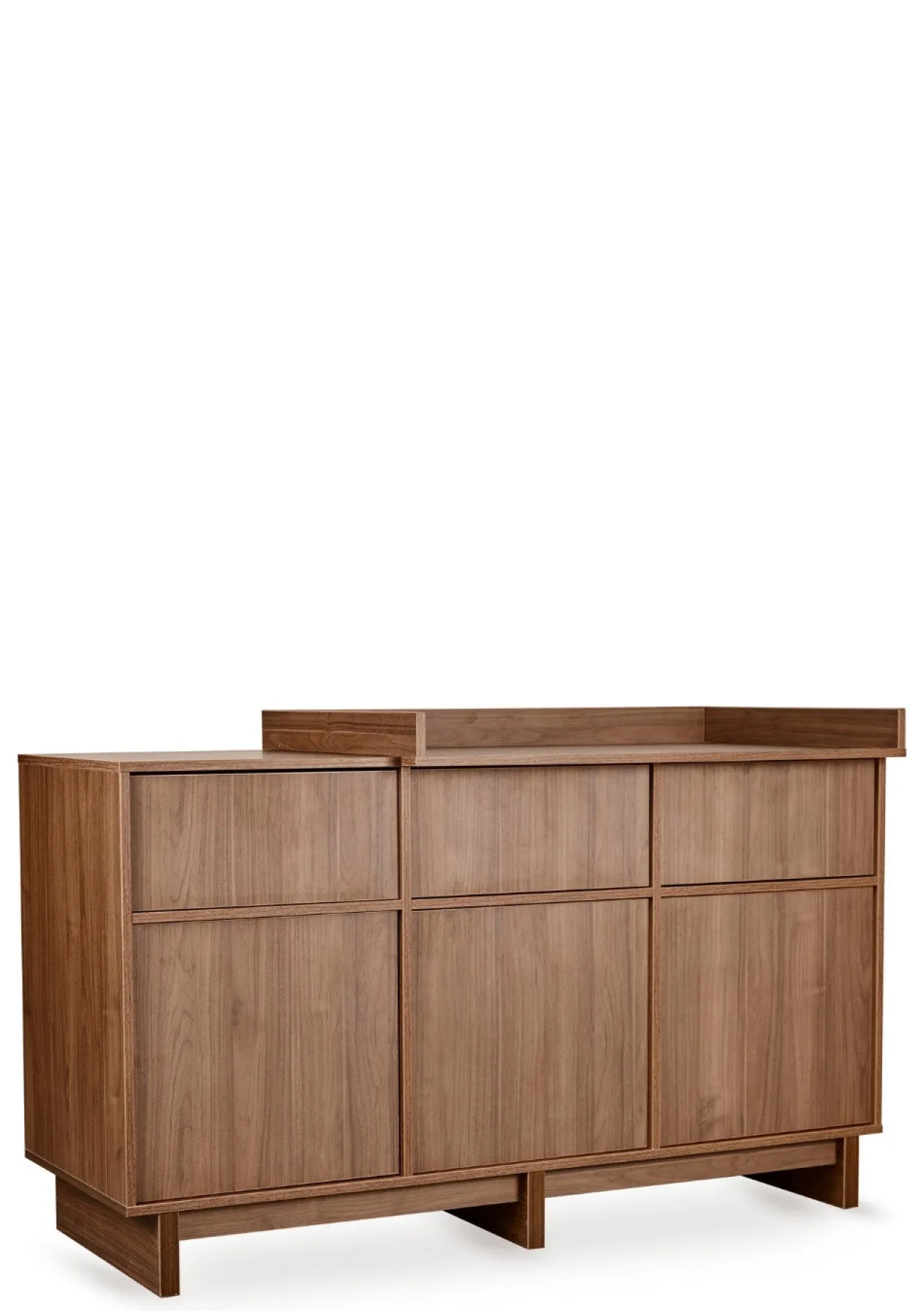 Mit ihrem extra breiten Format bietet die Kommode besonders viel Stauraum für Kleidung, Pflegeprodukte oder Alltagsutensilien. Hinter den drei Türen und in drei geräumigen Schubladen lassen sich alle Dinge des täglichen Lebens übersichtlich verstauen. In Kombination mit dem optional erhältlichen Wickelaufsatz wird sie zur praktischen Wickelkommode XL – perfekt für die ersten Jahre mit deinem Baby. Nach der Wickelzeit lässt sich der Aufsatz rückstandslos entfernen, sodass die Kommode als stilvolles Möbelstück im Kinder- oder Familienzimmer weiterbesteht. Ein hochwertiges Möbelstück, das mit der Familie mitwächst und viele Jahre Freude bereitet.