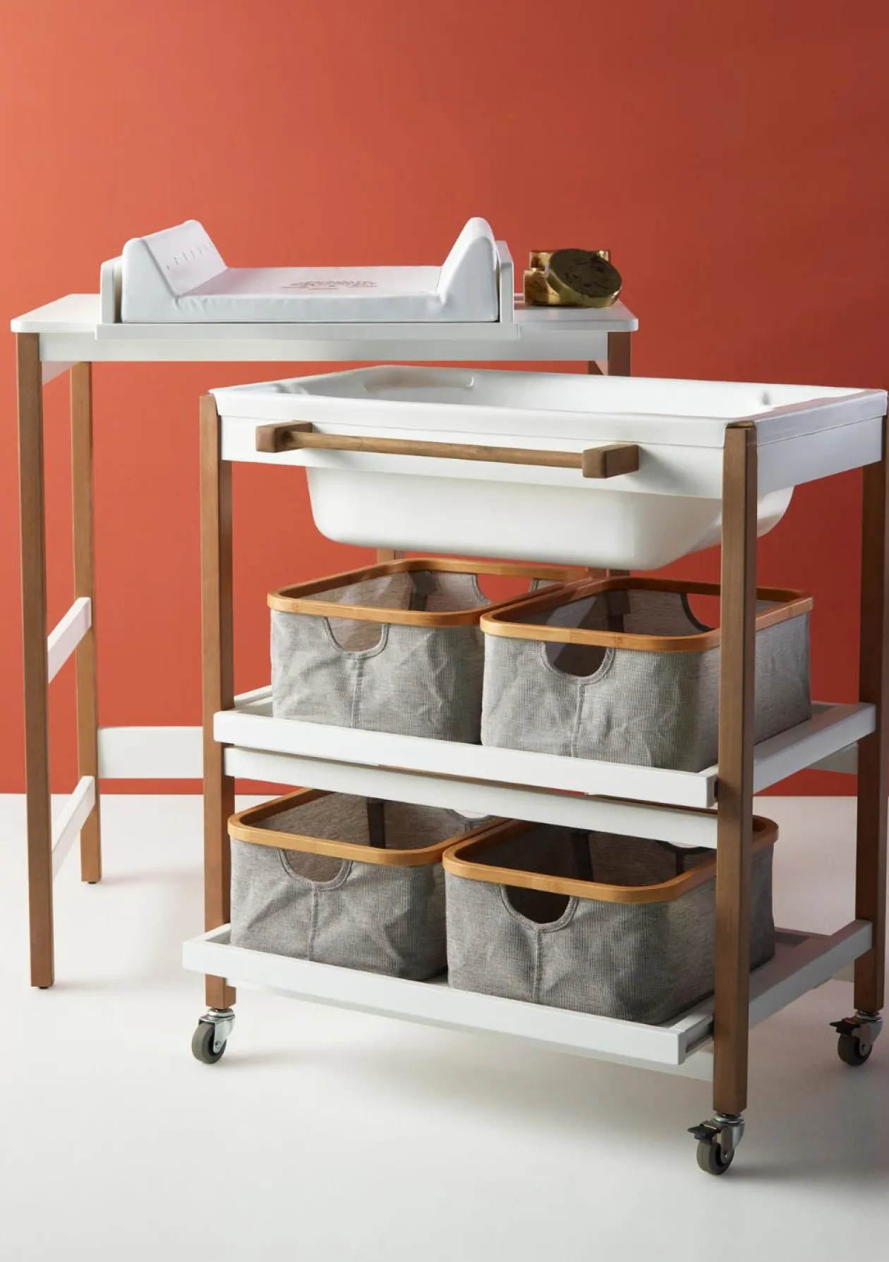 Diese wunderschöne Wickelstation des belgischen Labels QUAX vereint anspruchsvolles Design und durchdachte Funktionalität. Der Wickeltisch ist mit einen weiteren Korpus ausgestattet, der sich bei Bedarf herausrollen lässt und über eine integrierte Baby-Badewanne verfügt. Die herausziehbaren Regalbretter bieten viel Platz, für alles, was du beim Windeln wechseln, An- und Ausziehen oder Pflegen deines kleinen Lieblings immer griffbereit haben möchtest. Wirklich smart!